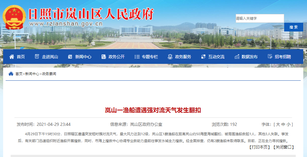 记者从山东日照兰山区人民政府网站获悉:4月29日15时30分左右,日照辖区遭遇突发短时强对流天气,局部海域阵风达11级。“鲁岚渔71001”在石臼港区以东42海里处翻扣,4人遇险,其中1人获救、3人失联。另有两艘渔船失联。目前两艘失联渔船情况正在调查中。