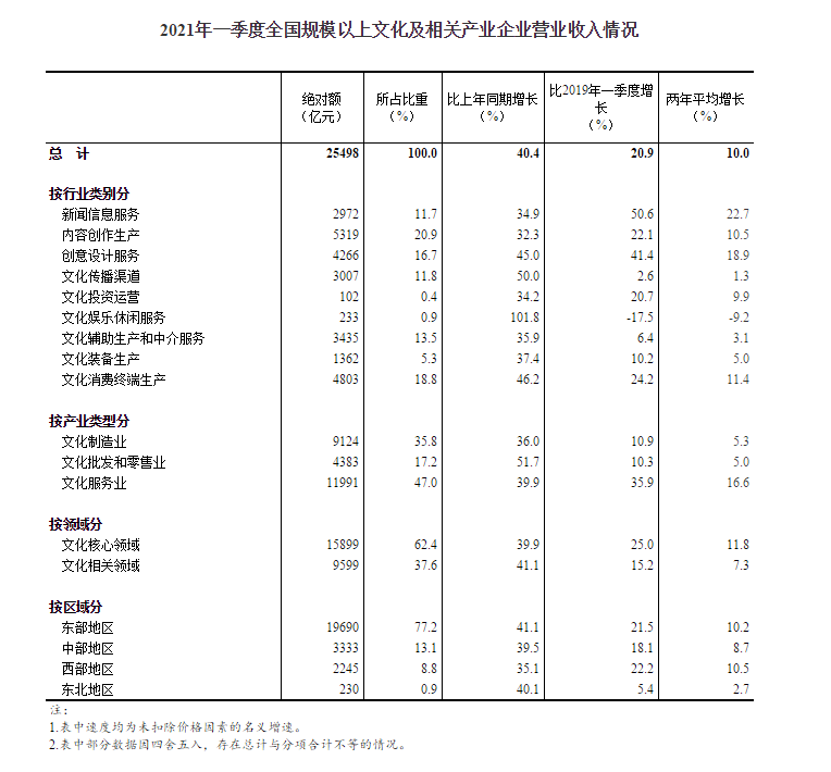 据对全国6.3万家规模以上文化及相关产业企业调查,2021年一季度,上述企业实现营业收入25498亿元,按可比口径计算,比上年同期增长40.4%;比2019年一季度增长20.9%,两年平均增长10.0%。