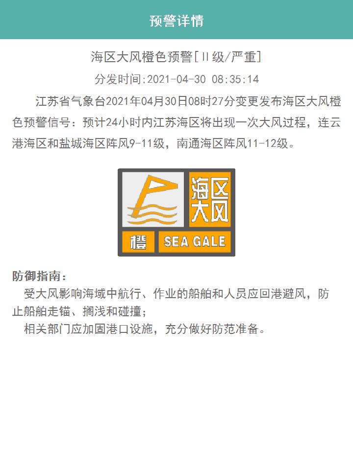 江苏省气象台2021年04月30日08时27分变更发布海区大风橙色预警信号:预计24小时内江苏海区将出现一次大风过程,连云港海区和盐城海区阵风9-11级,南通海区阵风11-12级。(总台央视记者 黄成)
