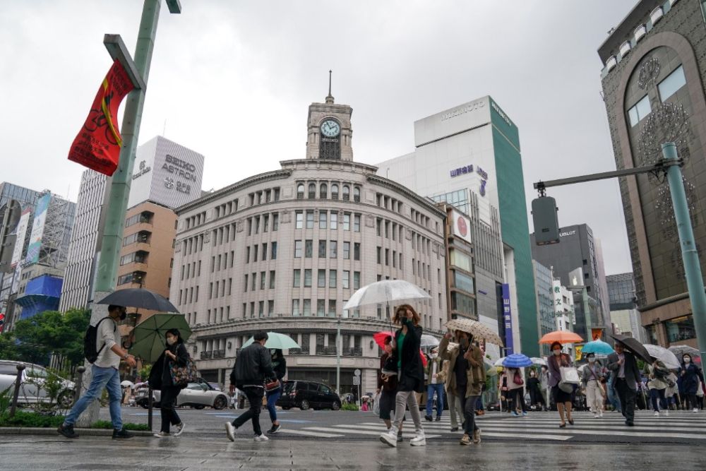 4月29日,戴口罩的行人走在日本东京银座街头。(新华社发,克里斯托弗·朱摄)