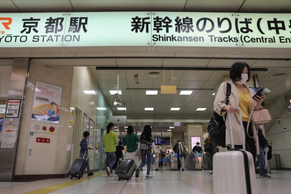 4月29日,戴口罩的乘客出入日本京都站新干线验票口。(新华社记者杜潇逸摄)