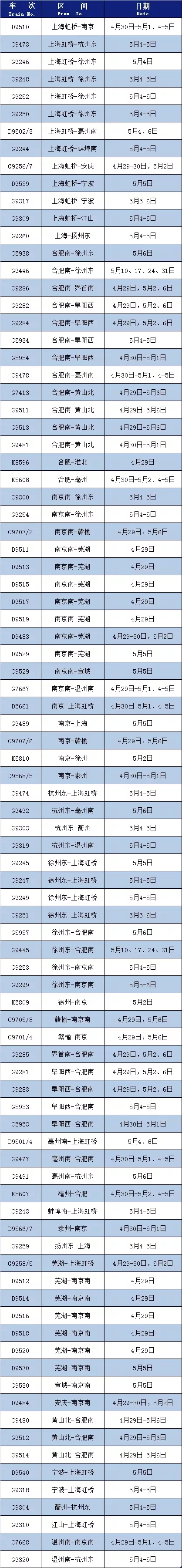 为满足旅客“五一”假期出行需求,长三角铁路部分列车恢复开行,同时增开多趟列车,铁路部门给大家整理了近期恢复开行和增开的列车车次,看看有没有你需要的车次↓