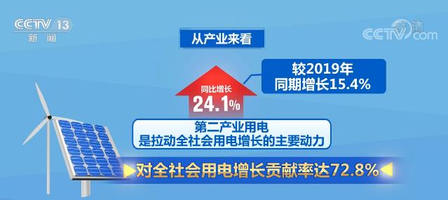 从产业来看,第二产业用电是拉动全社会用电增长的主要动力,同比增长24.1%,较2019年同期增长15.4%,对全社会用电增长贡献率达72.8%。其中,工业用电同比增长23.9%,制造业用电同比增长26.6%,特别是电气器材制造业、汽车制造业、通用设备制造业等用电同比增速超过50%。