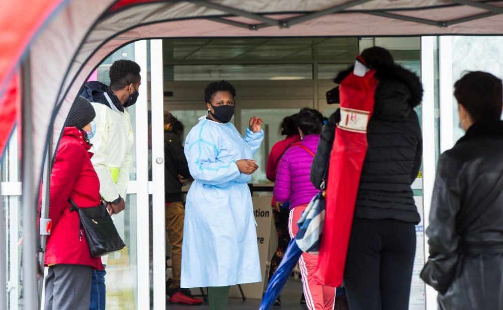 4月28日,在加拿大多伦多一个临时疫苗接种点,医护人员接待来接种的市民。(新华社发,邹峥摄)