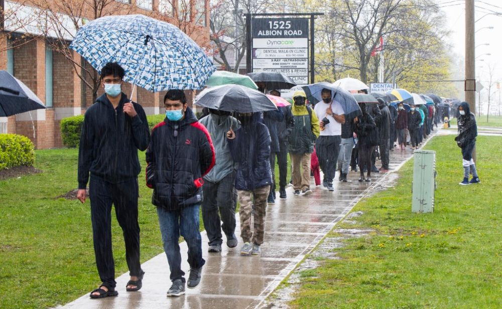 4月28日,在加拿大多伦多一个临时新冠疫苗接种点外,人们排队等待接种。(新华社发,邹峥摄)