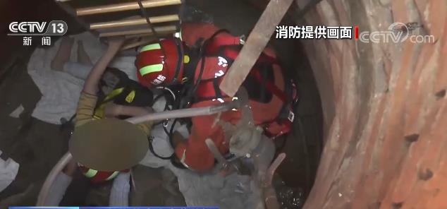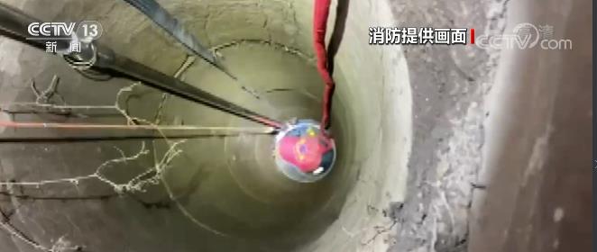 消防员根据现场情况,使用消防软梯下探到井底,消防员在为男孩做好安全防护措施后,利用井口上方的救援三脚架缓慢地将男孩往上拉。