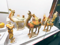 三彩牵驼俑及三彩骆驼 本报记者 阎彤摄