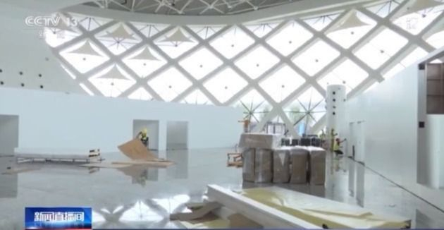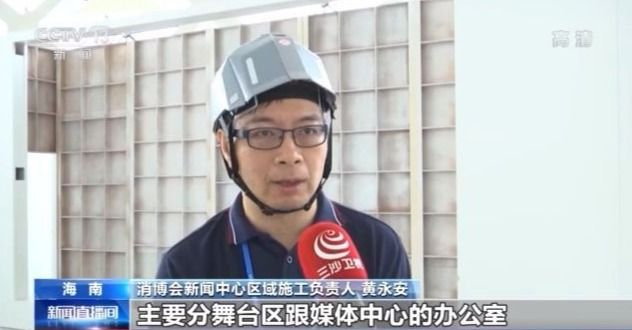 消博会新闻中心区域施工负责人 黄永安:(新闻中心区域)大约是1500平方米,主要分舞台区和媒体中心办公室,中间还有一个给记者用的媒体中心,相信明天中午可以施工完成,有一些AV(设备)也可以开始安装了。