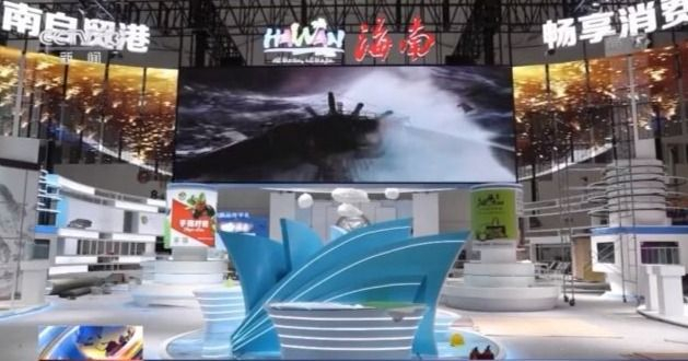 海南馆因提前搭台布展,整个展台已经初见规模和雏形,以蓝色和白色为主,融入了很多海南元素的设计,像海浪、贝壳和椰子树。