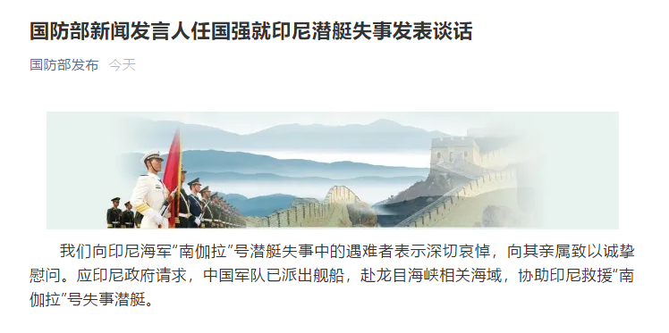 4月30日国防部发布消息,国防部新闻发言人任国强就印尼潜艇失事发表谈话。谈话内容如下: