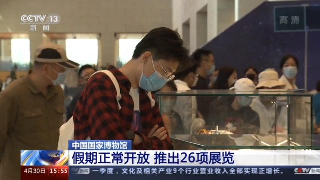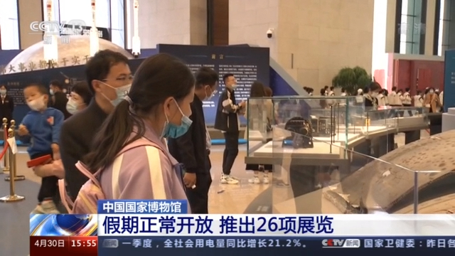 国家博物馆策展工作部负责人 胡妍:中国国家博物馆在五一期间,共有三个基本陈列展览,浓缩了中华5000多年的文明的辉煌灿烂,然后我们还有非常精彩的专题展览和临时展览,我们正在展出的这个月球样品001号,现在依然非常火爆,然后也希望大家尽快来看,因为我们将在5月7日就撤展了。