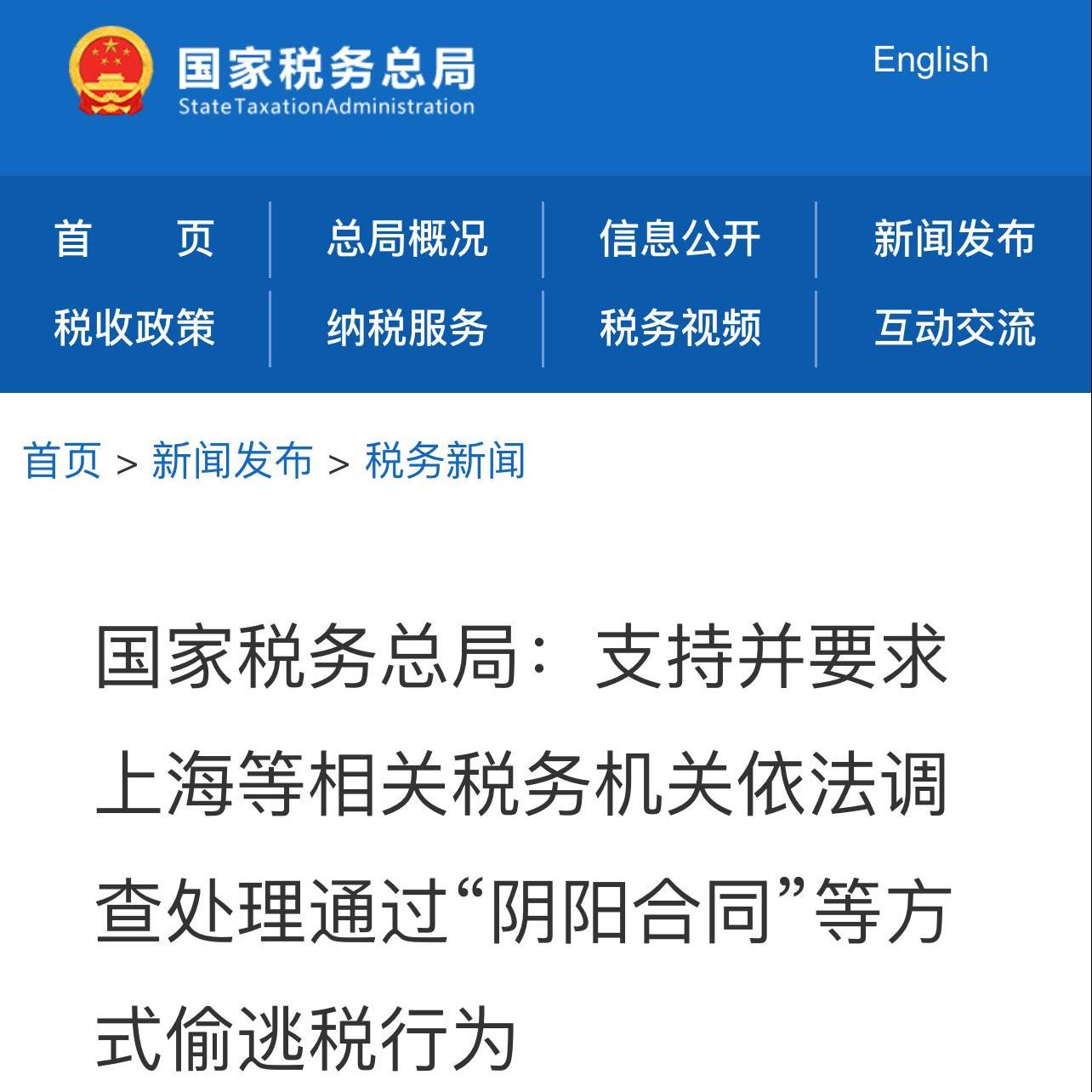 4月30日,国家税务总局表示,对群众举报的郑爽涉嫌偷逃税问题高度重视,已要求上海等相关税务机关对通过“阴阳合同”等方式涉嫌偷逃税行为依法依规进行严肃查处。