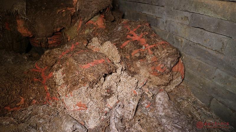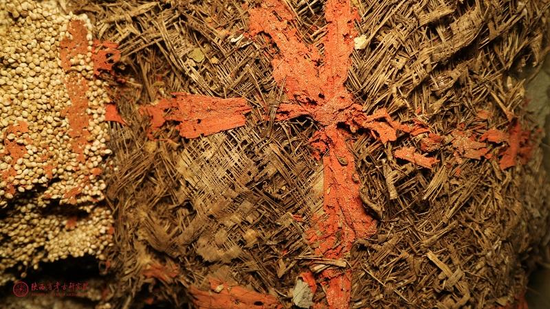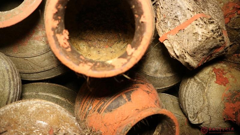 墓葬两耳室位于墓道北端东西两壁,均为砖构,侥幸逃过历次的盗扰。目前正在清理的东侧耳室拱顶使用楔形砖。内部遗物根据保存形态可划分为三个部分,耳室最内侧为陶制和原始瓷的罐类器皿,部分器皿口尚存编织物盖子,其中彩绘陶器颈部可见朱书的纪年文字,器物上方整体覆盖保存较好的苇席;耳室中部并排堆放束口的圆柱状粮食口袋,目前提取的样品经专家鉴定有大麻、黍、粟三种,口袋上部放置草席包裹,其外部红色带状织物捆扎呈“丰”字形;耳室最外侧为多排敞口的圆形口袋,袋口翻折,内侧可见一些褐色残留物,性质有待进一步的检测分析。根据现场情况推断,整个耳室地面应该先铺设一层草席,所有器物均置于其上。