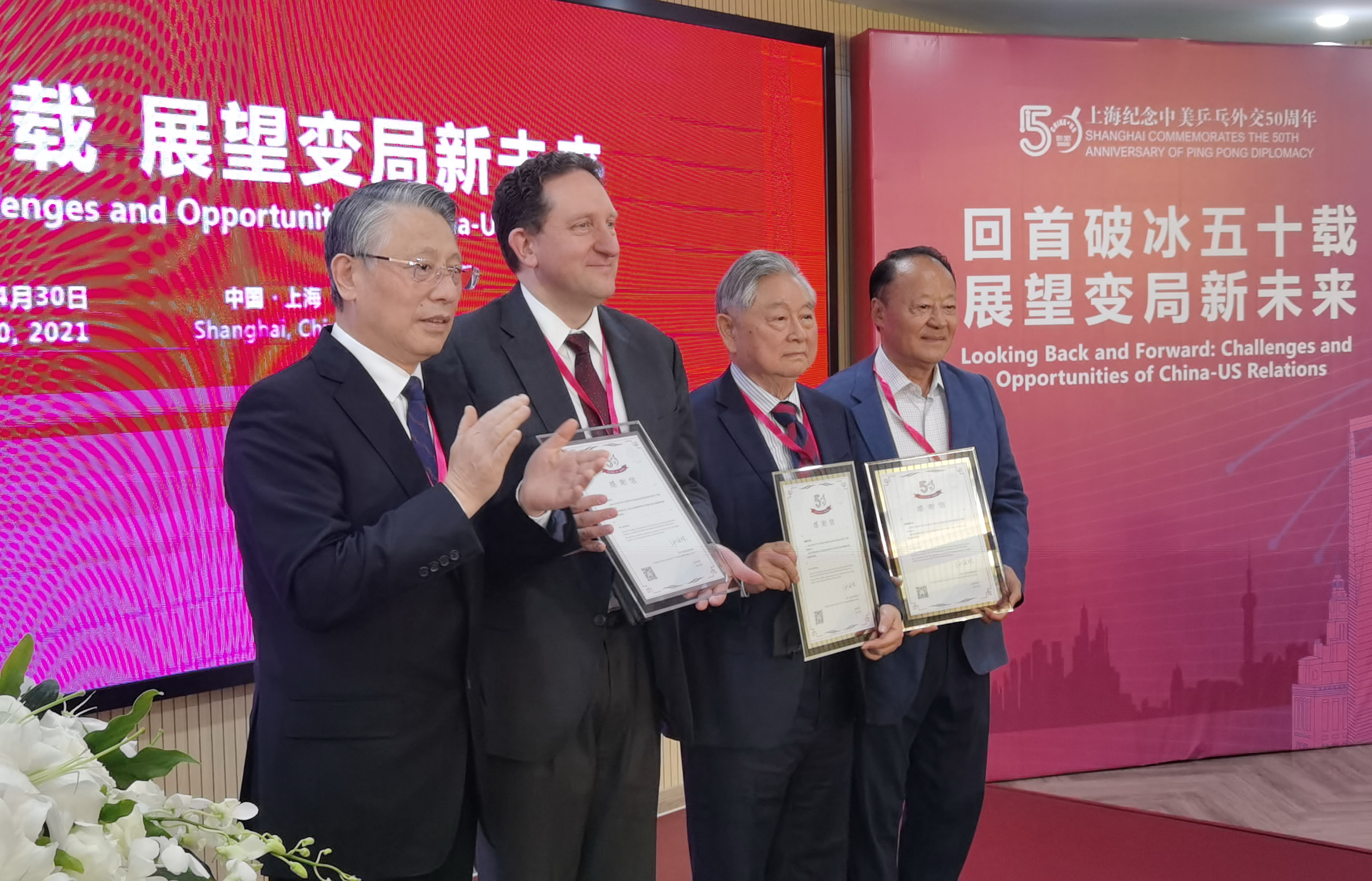 在这场特殊的报告会上,上海市人民对外友好协会会长沙海林作为上海纪念中美“乒乓外交”系列活动主办方代表,向当年的亲历者、中国乒乓球界元老徐寅生和李富荣颁发感谢铭牌,詹姆斯·赫勒总领事代表简·巴里斯副会长接受了感谢铭牌。这一用中英两种文字书写的感谢铭牌,向当年中美“乒乓外交”的亲历者致以“最诚挚的感谢和最崇高的敬意”。