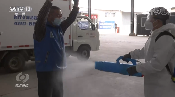 李佳兴是这家冷链企业的食品安全管理师,给大伙儿开完晨会,李佳兴回到办公室,和搭档李超一起换上防护服,准备迎接从全国各地送来的冷链货物,平均每天有50车货物需要入库,他们要对所有车辆和货物进行消杀。
