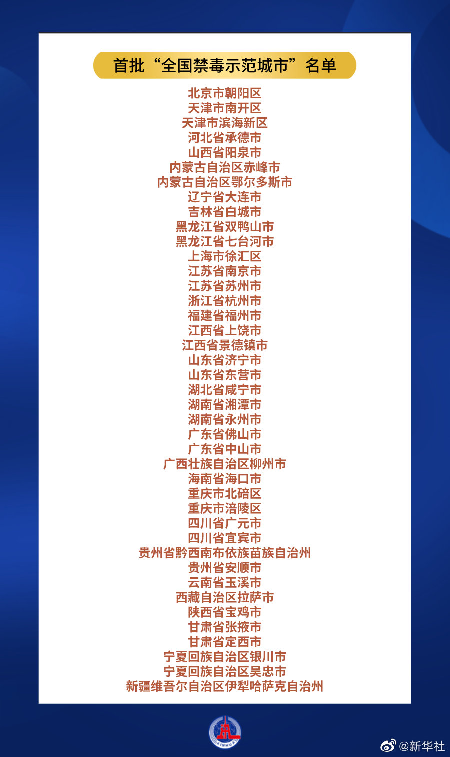 新华社北京4月30日电(记者熊丰)记者30日从国家禁毒委获悉,为培育禁毒示范地区先进典型,发挥示范引领带动作用,进一步激发各地开展禁毒工作的积极性、主动性、创造性,推动新时代禁毒人民战争持续深入开展,国家禁毒委员会根据创建示范工作有关规定,按照从严把关、优中选优的原则,决定命名北京市朝阳区等41个地区为首批“全国禁毒示范城市”。