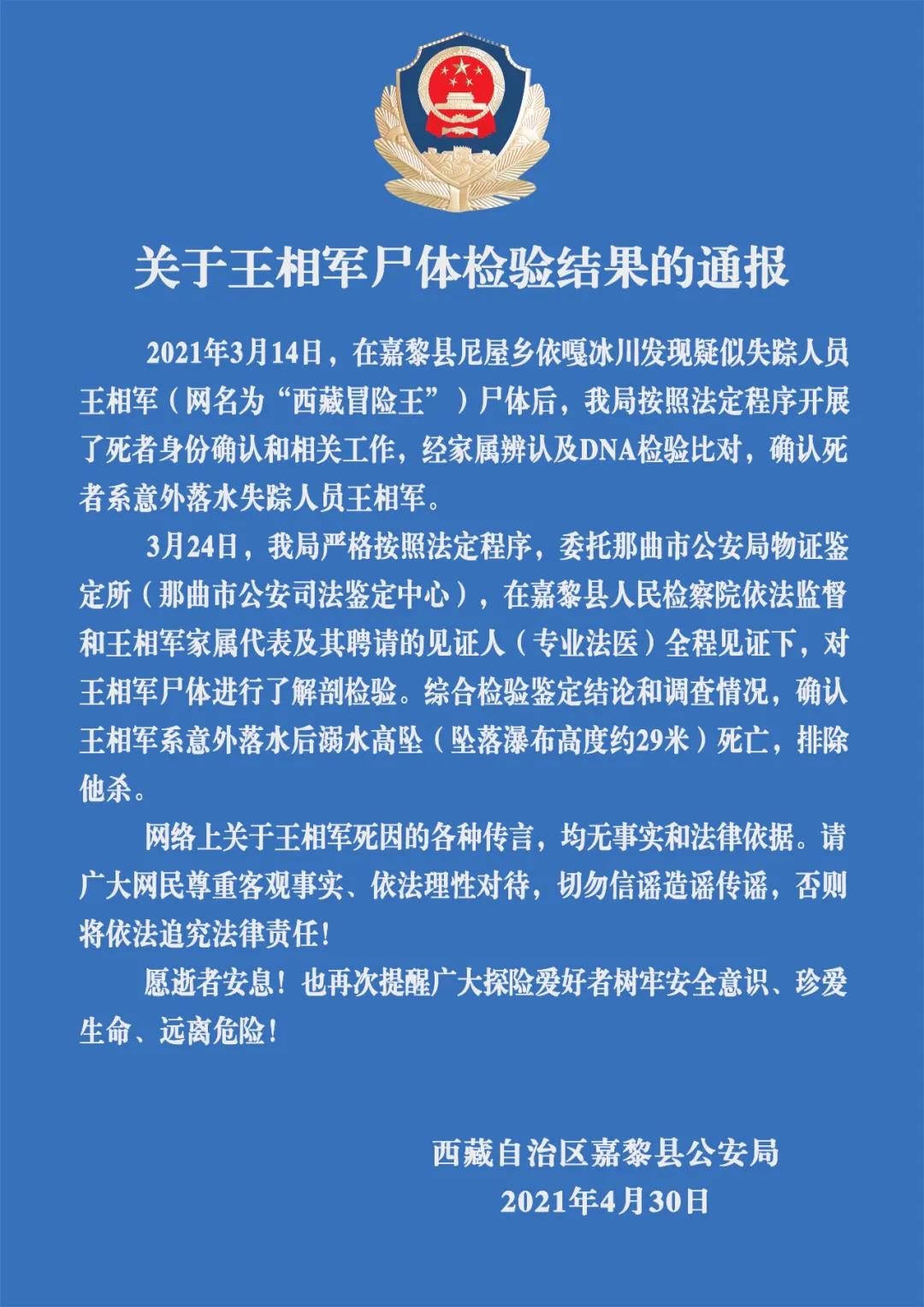 微信公众号“嘉黎公安”发布关于王相军尸体检验结果的通报。通报指出,网名为“西藏冒险王”的王相军系意外落水后溺水高坠死亡,排除他杀。