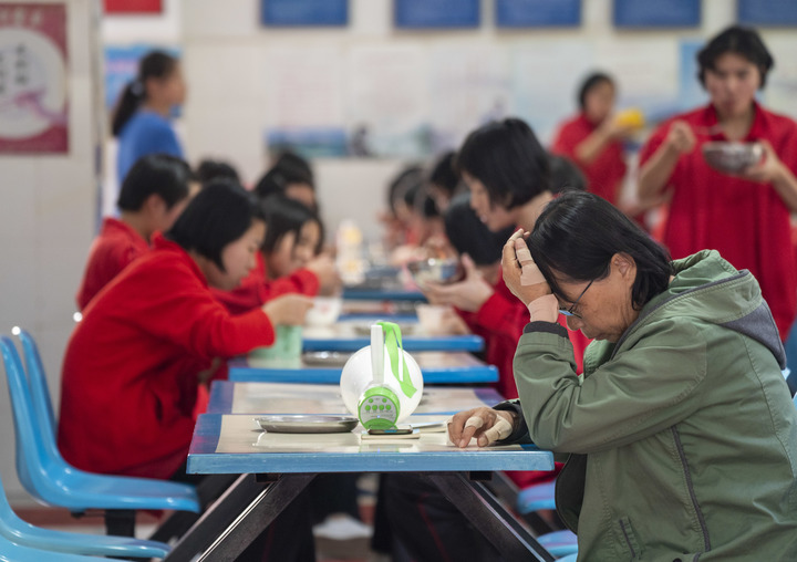 吃完药,张桂梅又坐着电动车赶到食堂,她要守着学生们吃饭。在她严格要求下,学生吃饭时间被限定在15分钟以内,形成了良好的时间观念。