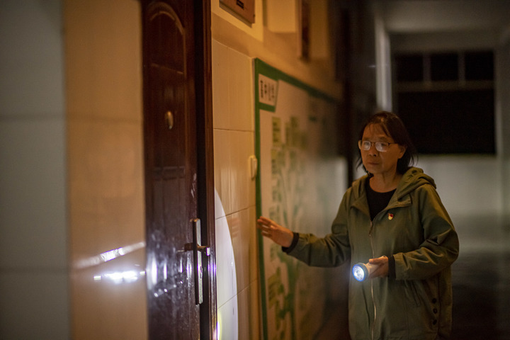 22点38分,张桂梅在华坪女子高级中学进行夜间的安全巡查。(3月24日摄)