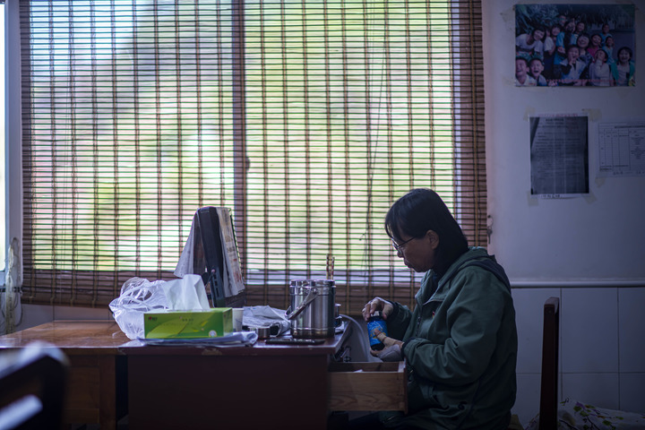 午饭,张桂梅每天都是在办公室里吃的。因有胃病,她一般只能喝点粥、吃一块饼,然后把办公桌抽屉里一个个瓶瓶罐罐翻出来,把一大把药片塞进嘴里。