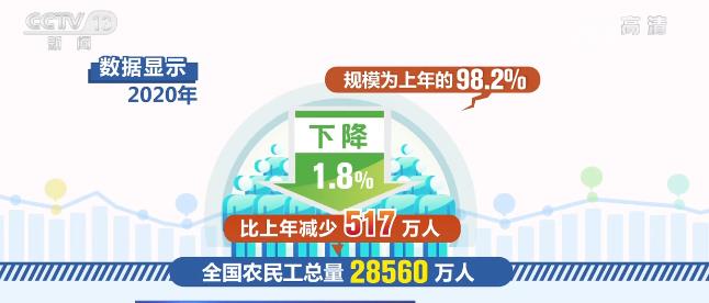 数据显示,2020年全国农民工总量28560万人,比上年减少517万人,下降1.8%,规模为上年的98.2%。其中,外出农民工16959万人,比上年减少466万人,下降2.7%;本地农民工11601万人,比上年减少51万人,下降0.4%。