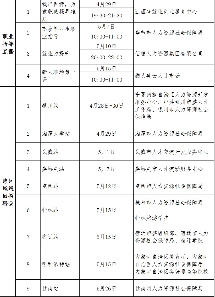 线下活动9场:举办银川站、桂林站、嘉峪关站等9场跨区域巡回招聘会,除本地用人单位外,还将邀请外省市人社部门组织用人单位组团参会招聘。