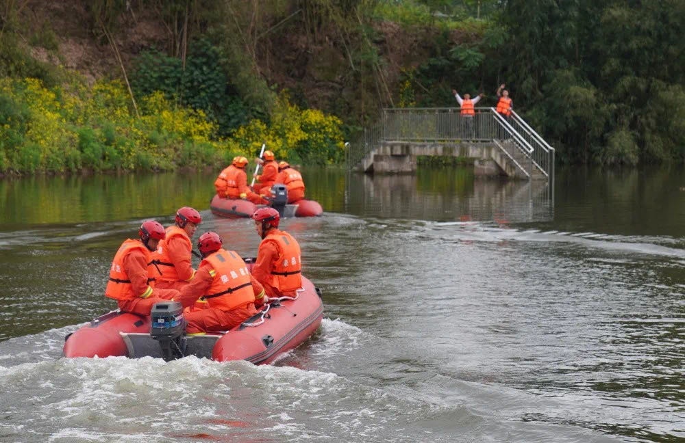 图为4月24日,重庆市荣昌区开展防汛综合应急演练,模拟解救洪水被困人员。(重庆市荣昌区应急管理局供图)