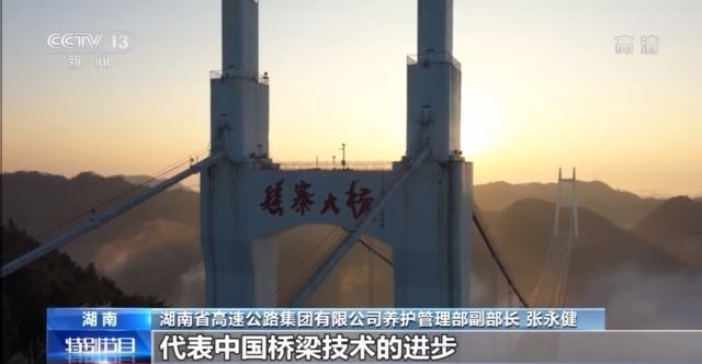 湖南省高速公路集团有限公司养护管理部副部长 张永健:我们交通人常说一句话,干一个项目,树一座丰碑。我觉得矮寨大桥像丰碑一样,它代表着我们中国高速的发展,代表中国桥梁技术的进步,代表我们湖南人敢为人先的精神。