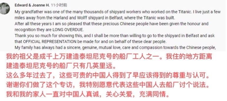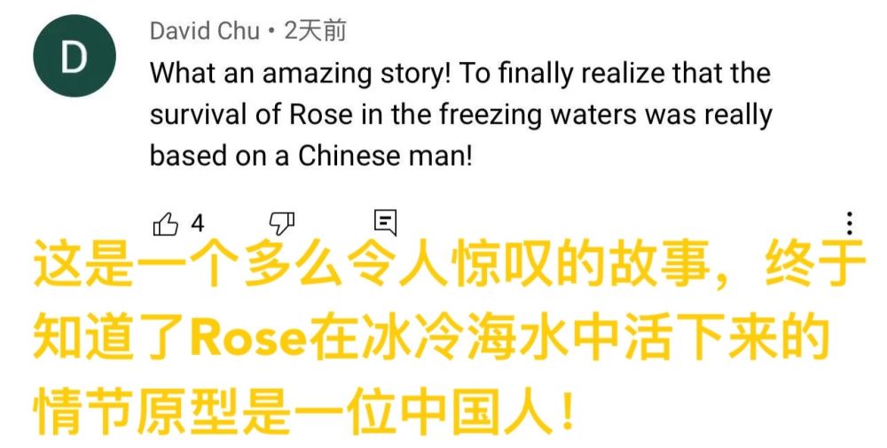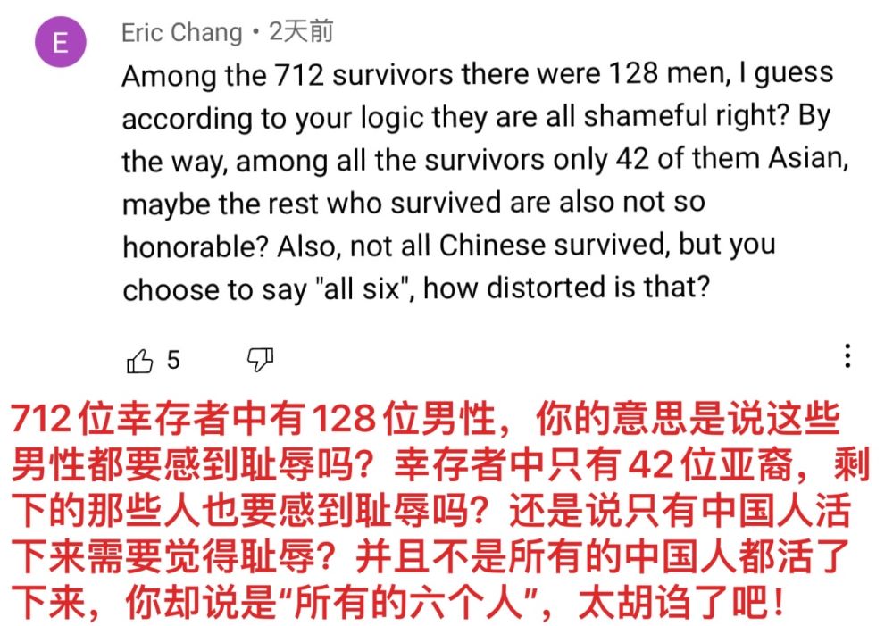 泰坦尼克号上的中国幸存者,也是积贫积弱年代中国人的真实写照。面对极其巨大的负面力量时,他们从未停止过抗争。泰坦尼克号巨轮沉没之殇至今已被人铭记109年,六名中国幸存者和他们身后华人群体对不公的抗争史同样值得被世人铭记。有网友自称是参与建造泰坦尼克号的工人后代,并疾呼中国幸存者早应该得到正名。