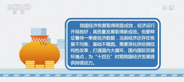 2021年是我国现代化建设进程中具有特殊重要性的一年,也是“十四五”开局之年。一季度同比增长18.3%、两年平均增长5%,“十四五”开局首季,中国经济交出一份可圈可点的“成绩单”。会议认为,我国经济恢复取得明显成效,经济运行开局良好,高质量发展取得新成效。但要辩证看待一季度经济数据,当前经济还存在恢复不均衡、基础不稳固。需要深化供给侧结构性改革,打通国内大循环、国内国际双循环堵点,为“十四五”时期我国经济发展提供持续动力。