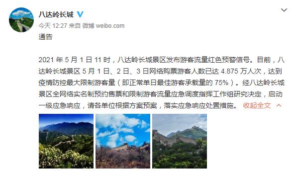 中新网5月1日电 八达岭长城官方微博1日发布通告称,5月1日11时,八达岭长城景区发布游客流量红色预警信号。目前,八达岭长城景区5月1日、2日、3日网络购票游客人数已达4.875万人次,达到疫情防控最大限制游客量(即正常单日最佳游客承载量的75%)。