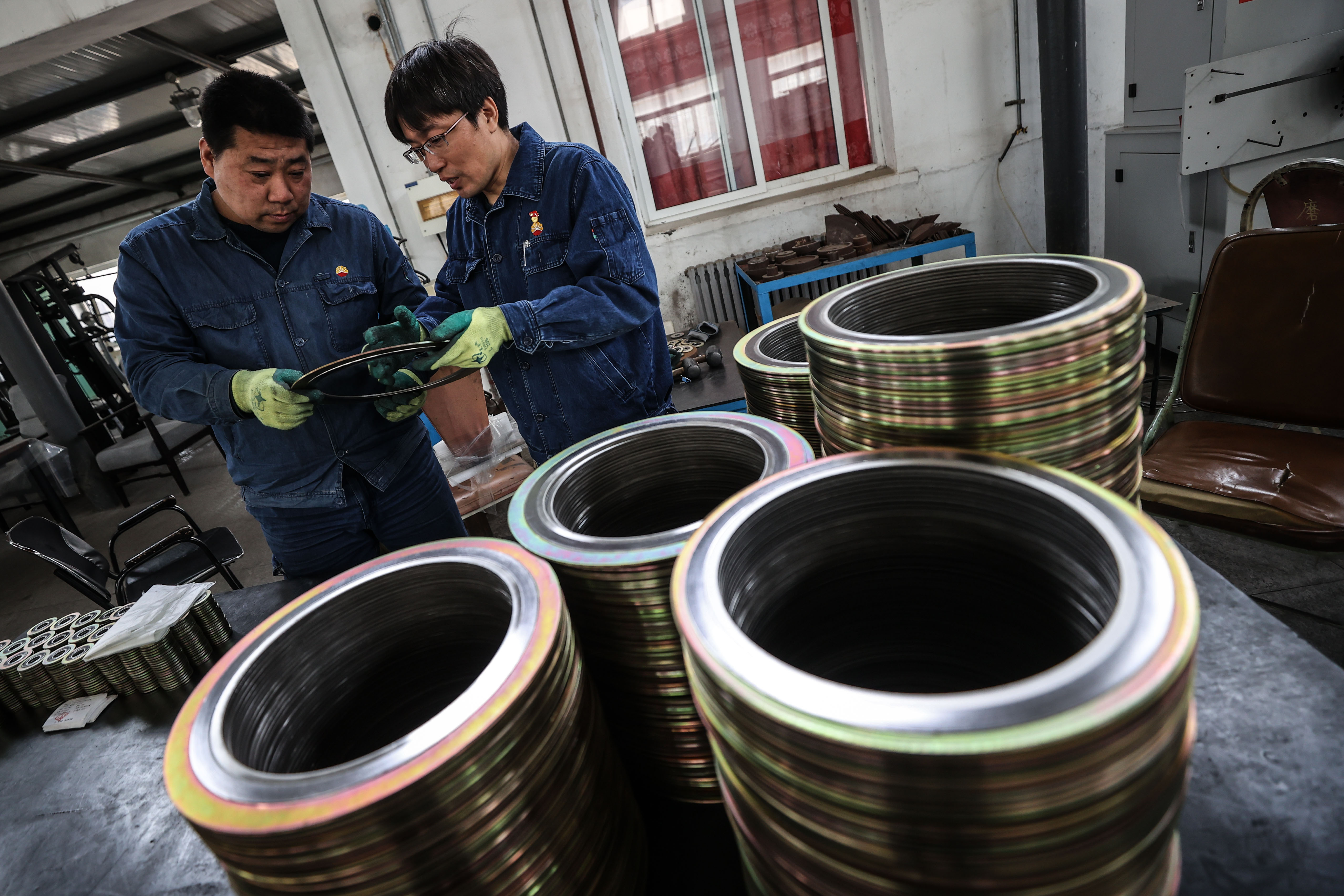 4月30日,王尚典(右)与同事在检查生产的垫片产品是否合格。