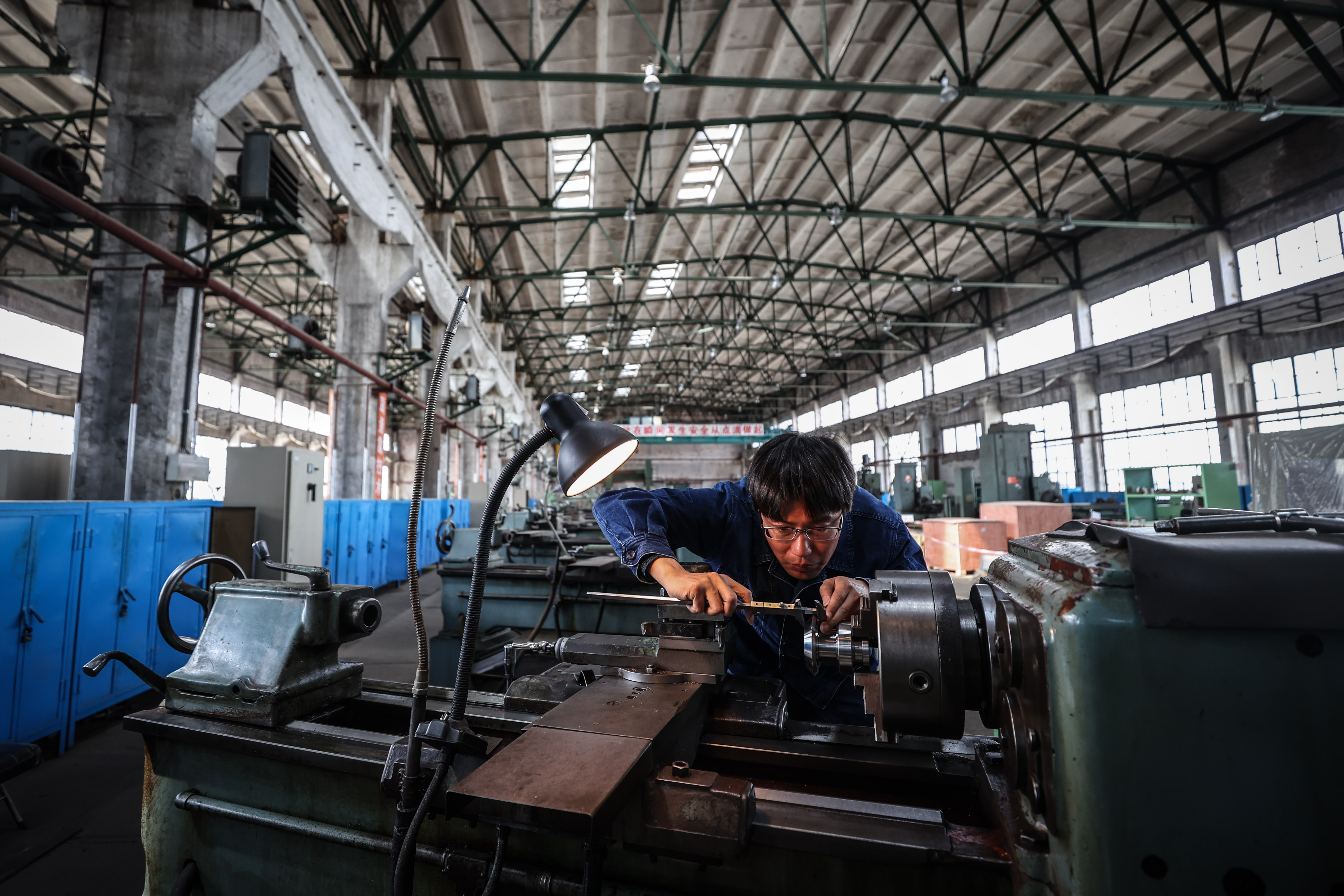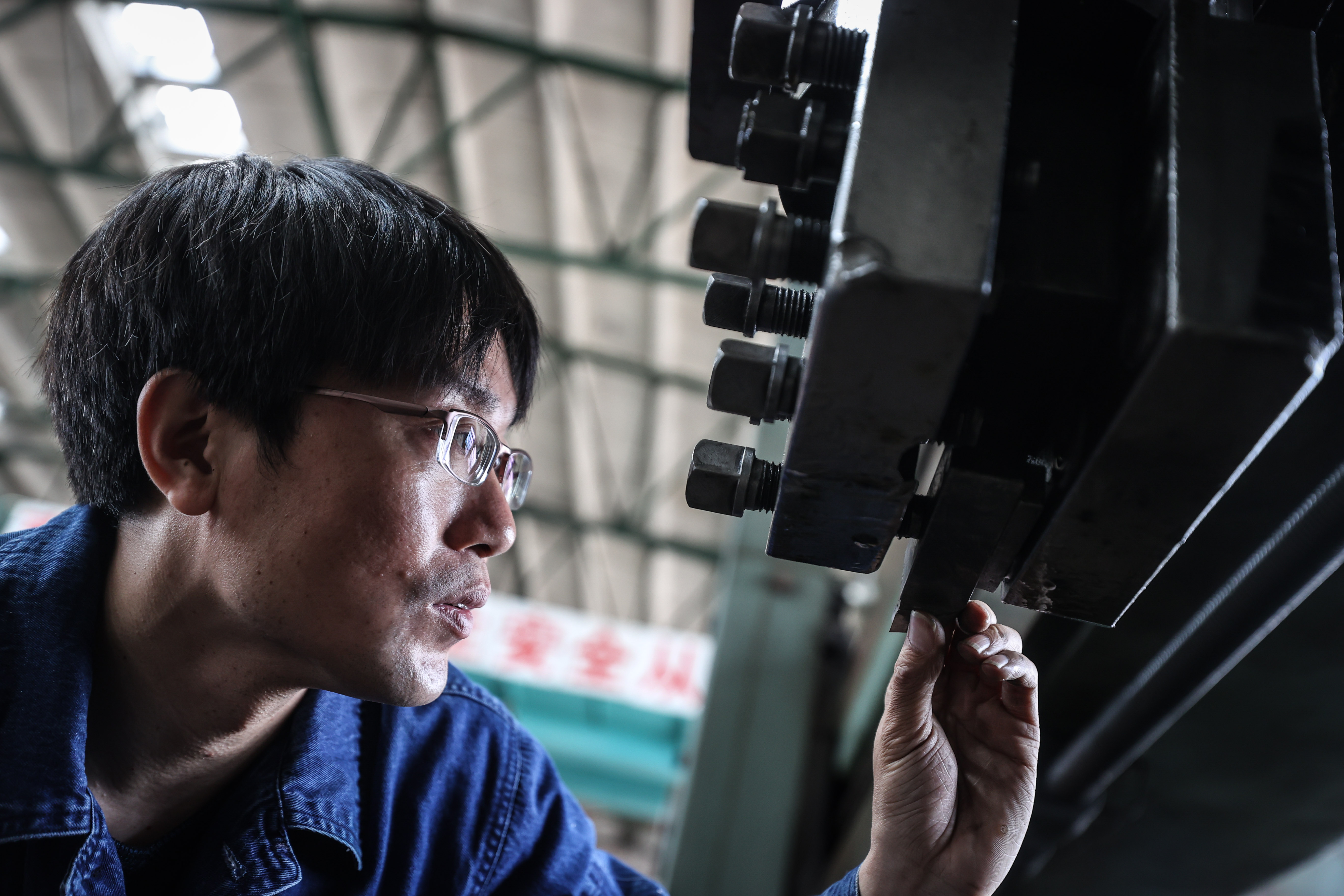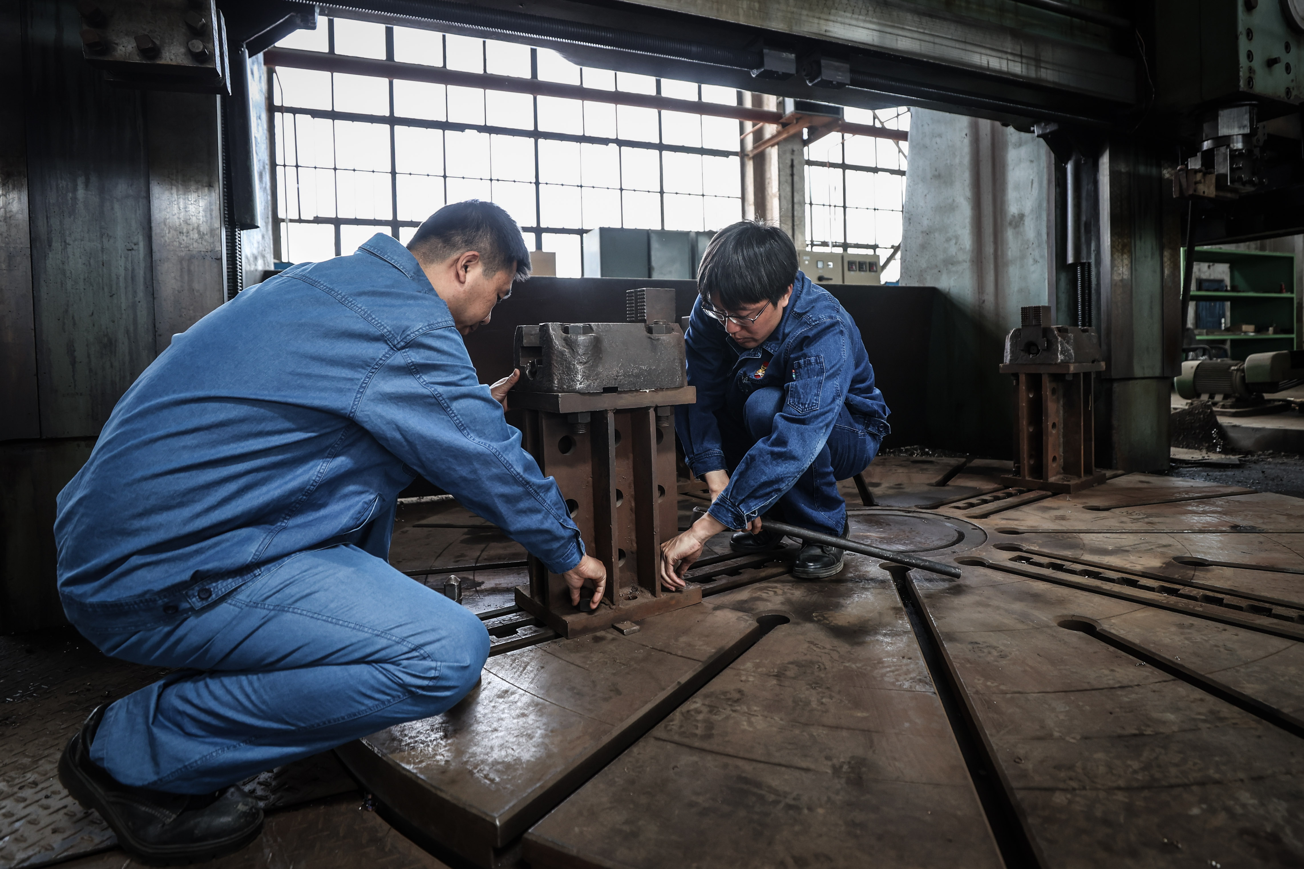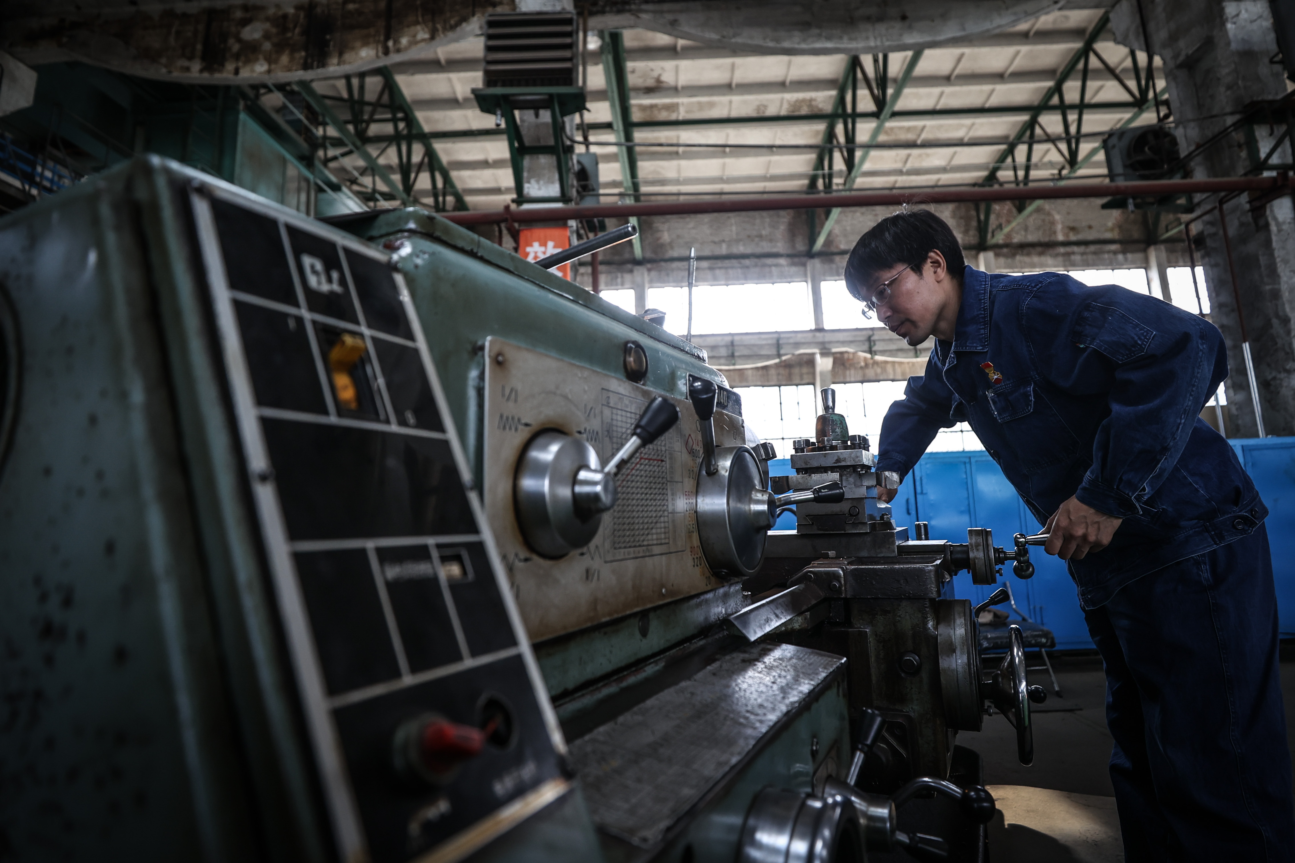 4月30日,王尚典(右)与同事对机床进行调整准备加工配件。