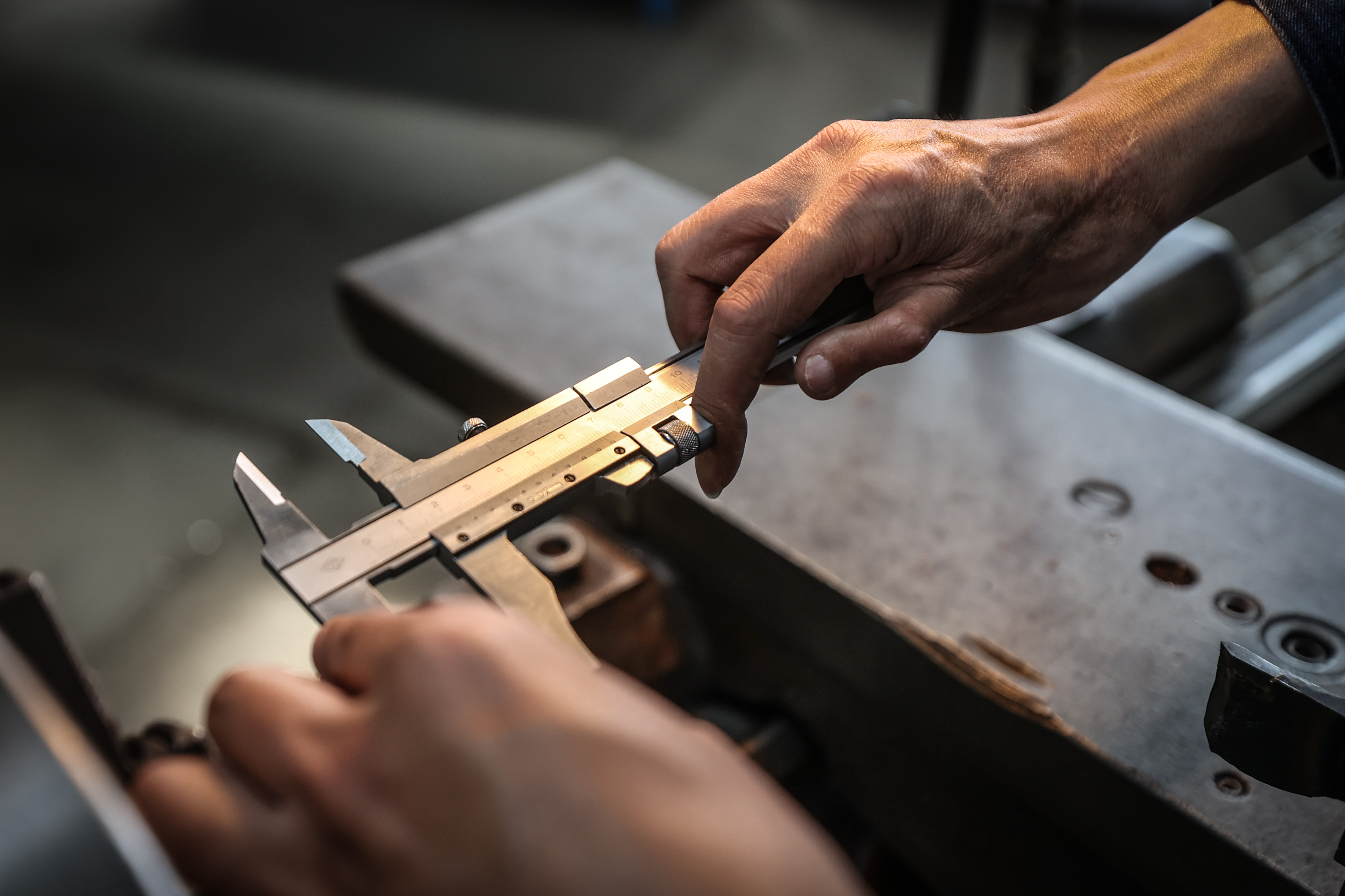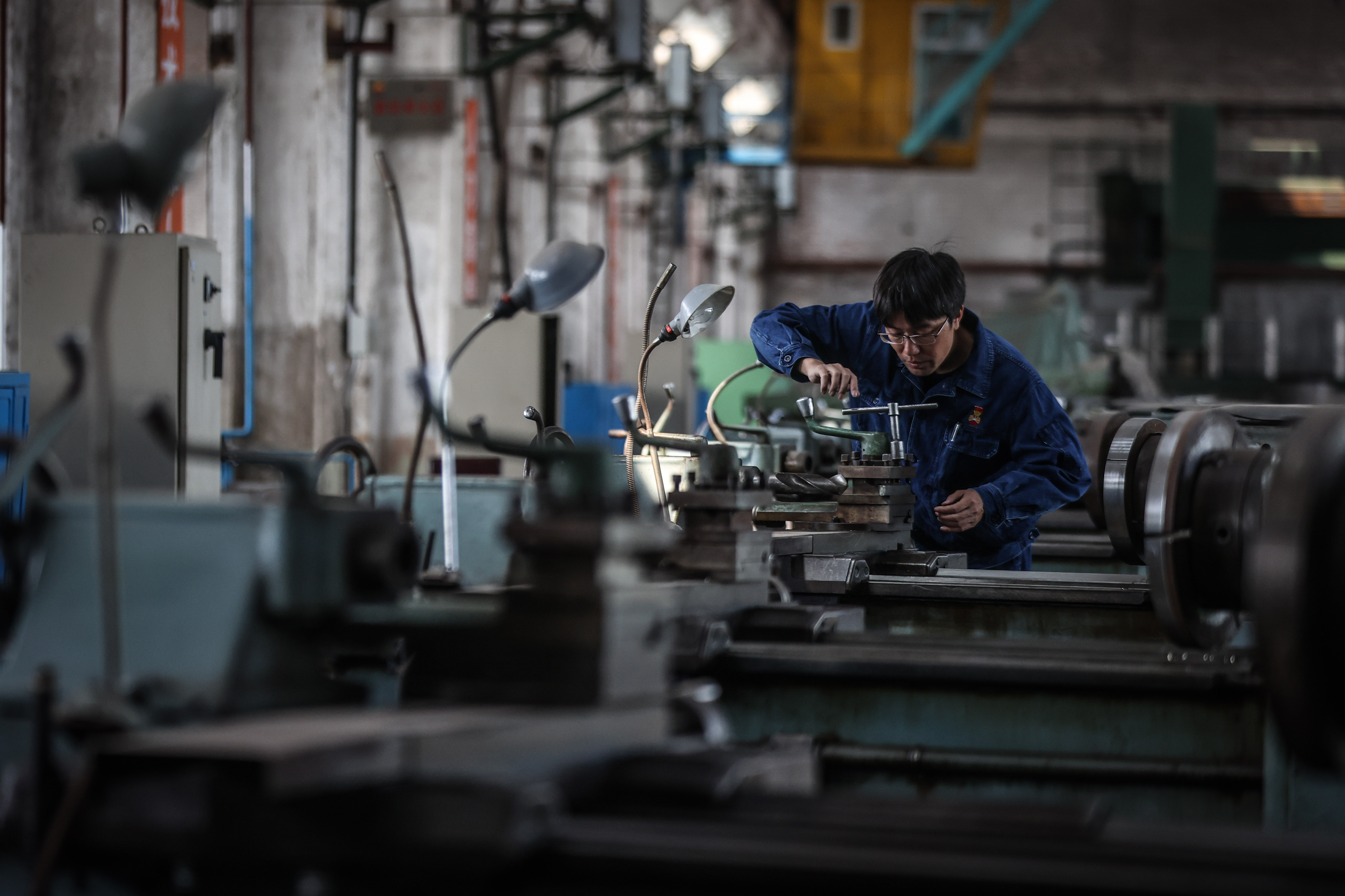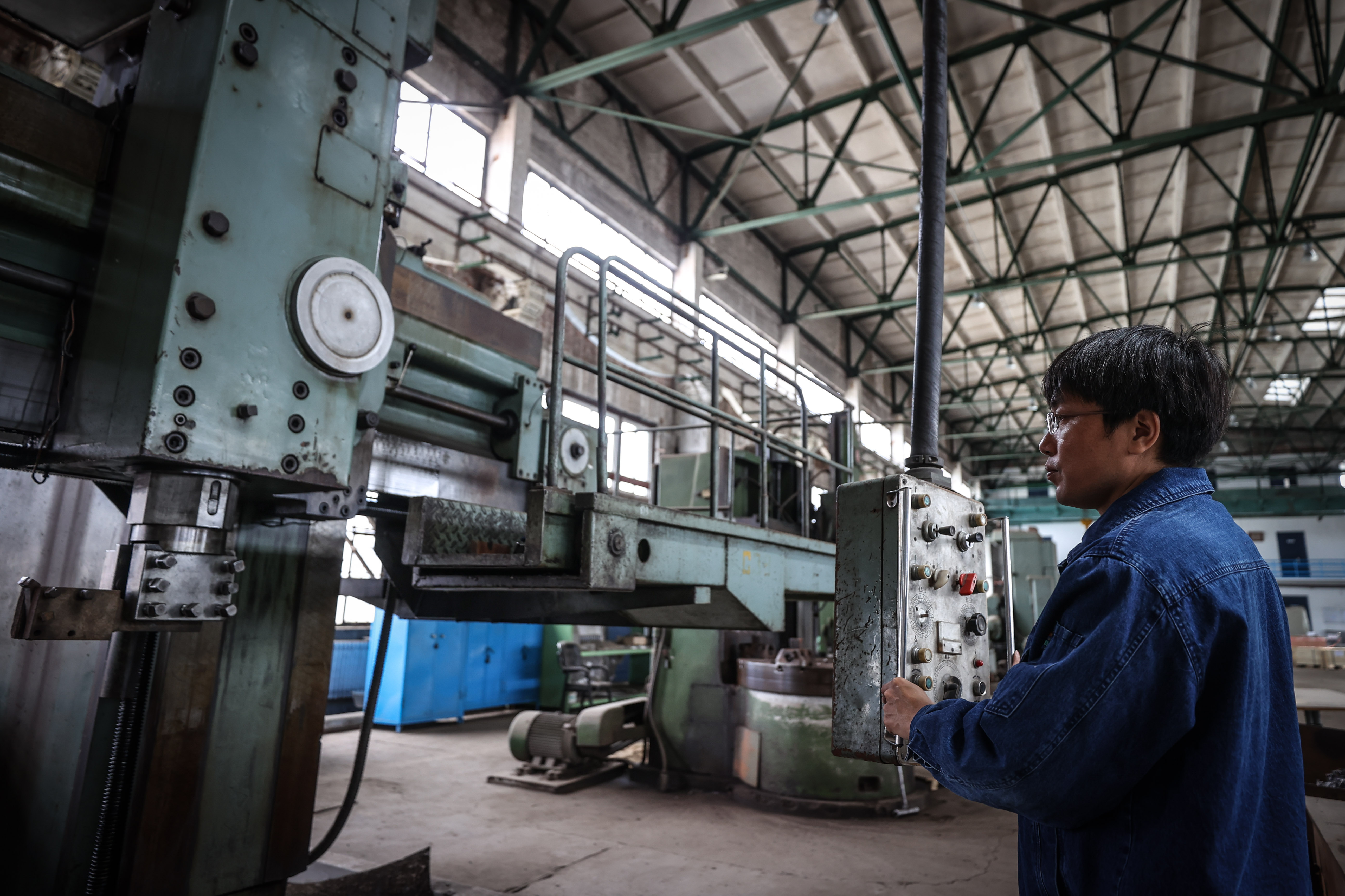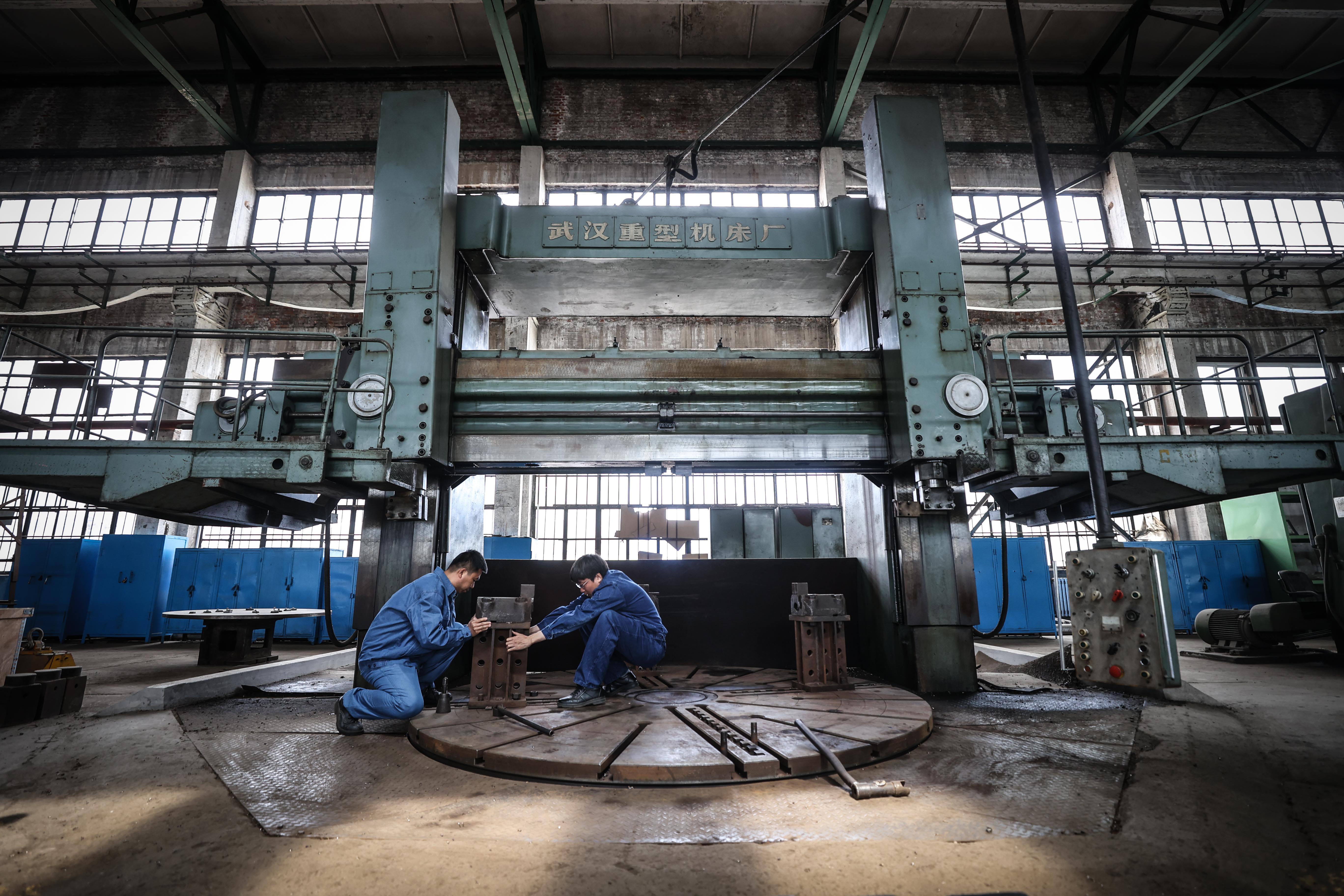 4月30日,王尚典(右)与同事对机床进行调整准备加工配件。
