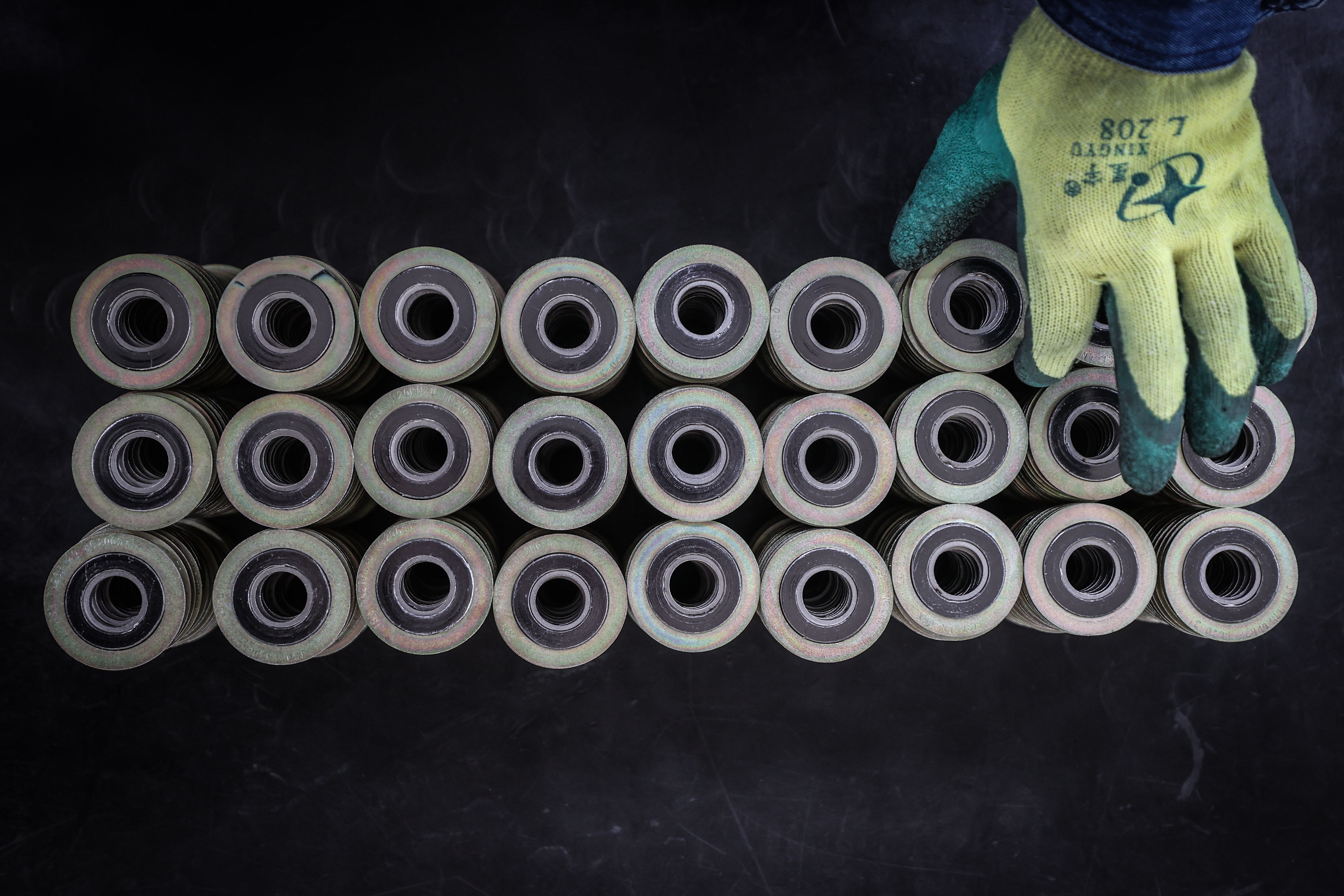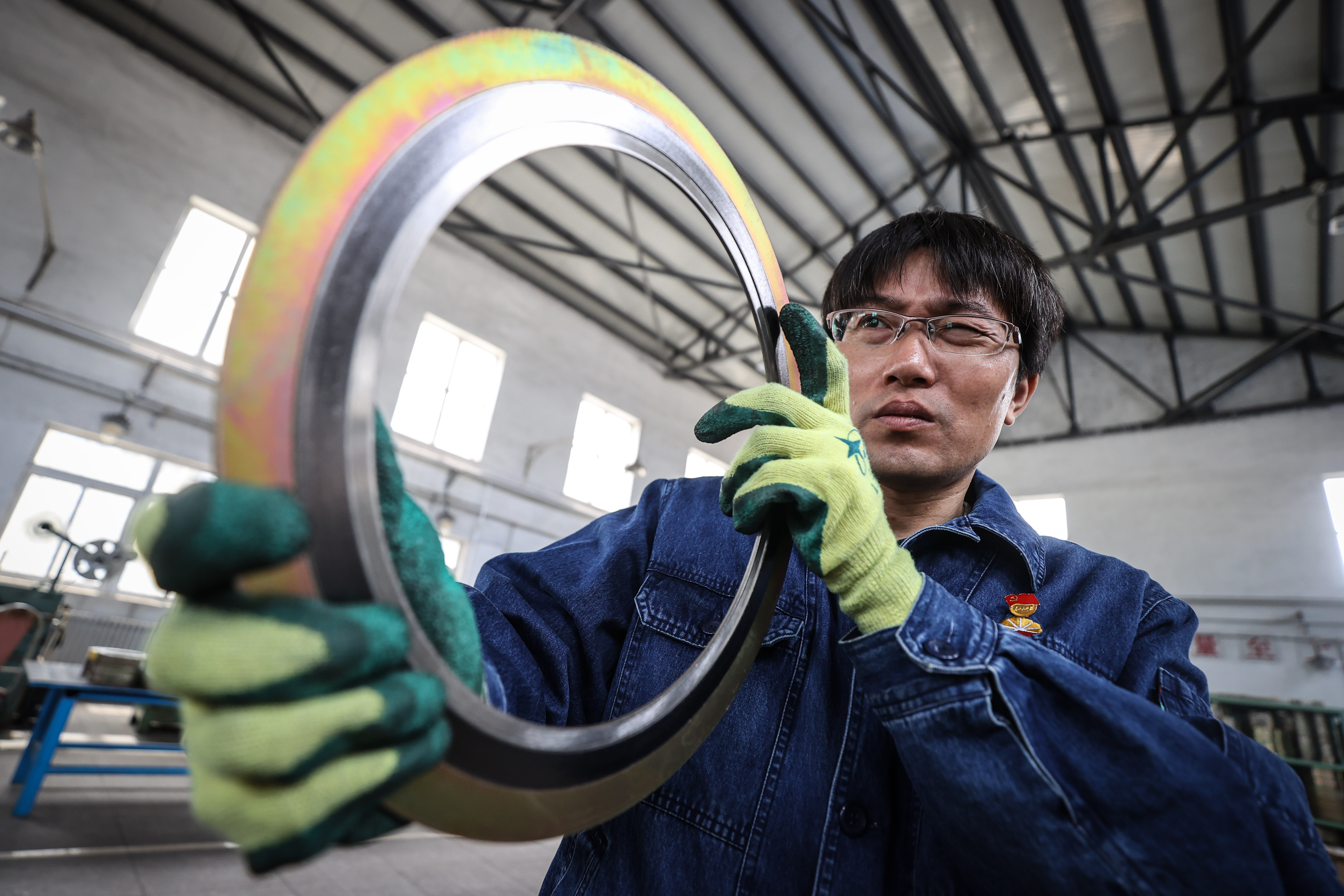 4月30日,王尚典在检查生产的垫片产品是否合格。