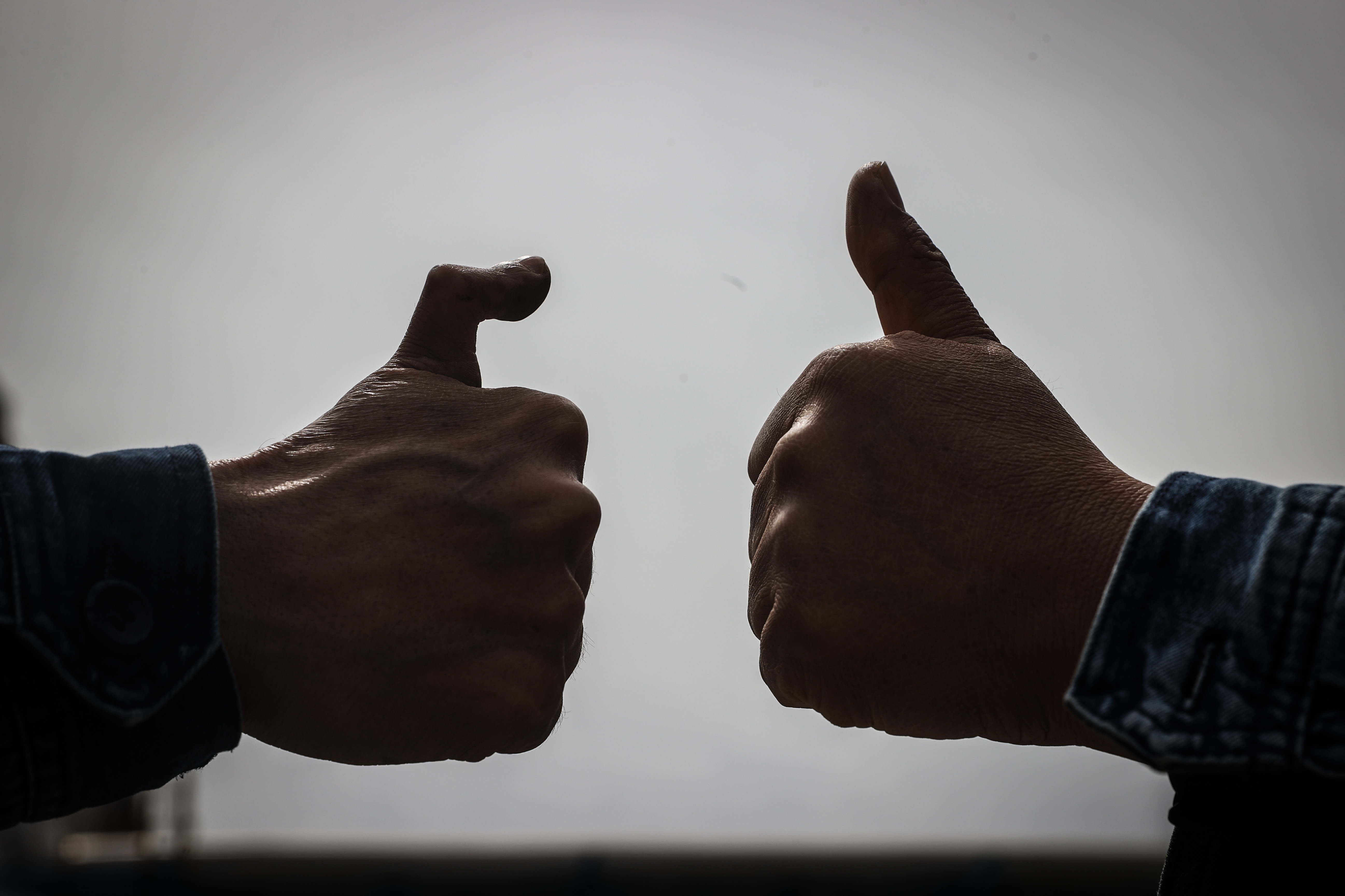 4月30日,王尚典(左)与同事一起做出“赞”的手势。