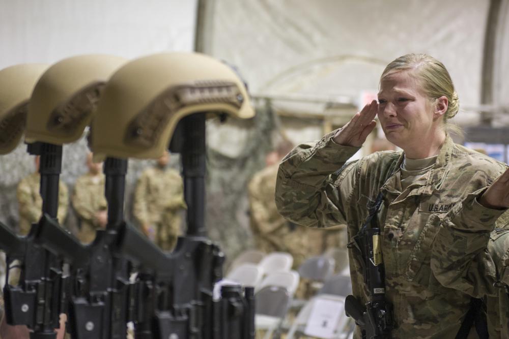 △2015年12月23日,一名美军士兵在美军驻阿富汗的巴格拉姆空军基地向死于自杀式袭击的6名战友表达敬意(图片来源:美联社)