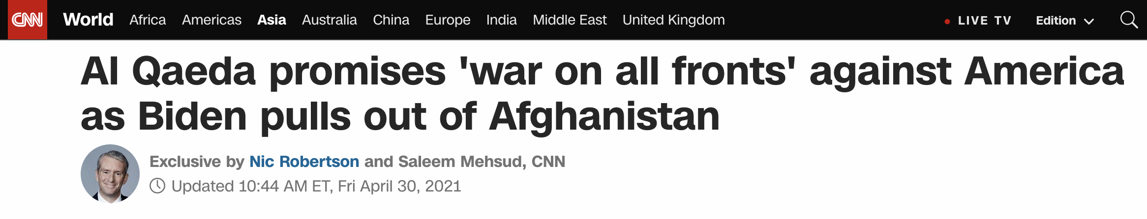 2001年“9·11”事件后,美国为消灭“基地”组织头目本·拉登,发起了阿富汗战争。如今,近20年过去,本·拉登被美国特种部队击毙也已整整十年。就在今年美军开始撤离阿富汗时,两名“基地”组织成员4月30日通过美国有线电视新闻网声称,其与美国的战争远未结束,“对美国的战争将在其他战线上继续,除非他们被驱逐出伊斯兰世界”。