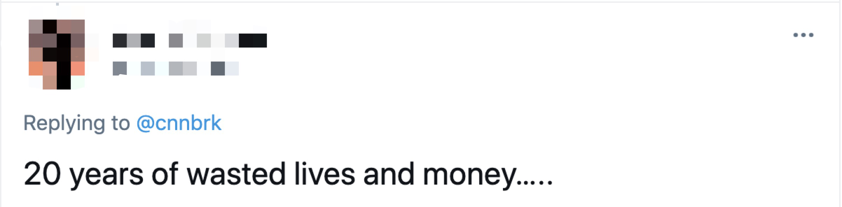 在海外社交媒体平台上,有网民称,美军在阿富汗的近20年不过是“浪费生命和金钱”。还有网民认为,美军在阿富汗并未让阿富汗民众感到安全,说明美国的“反恐”努力失败了。