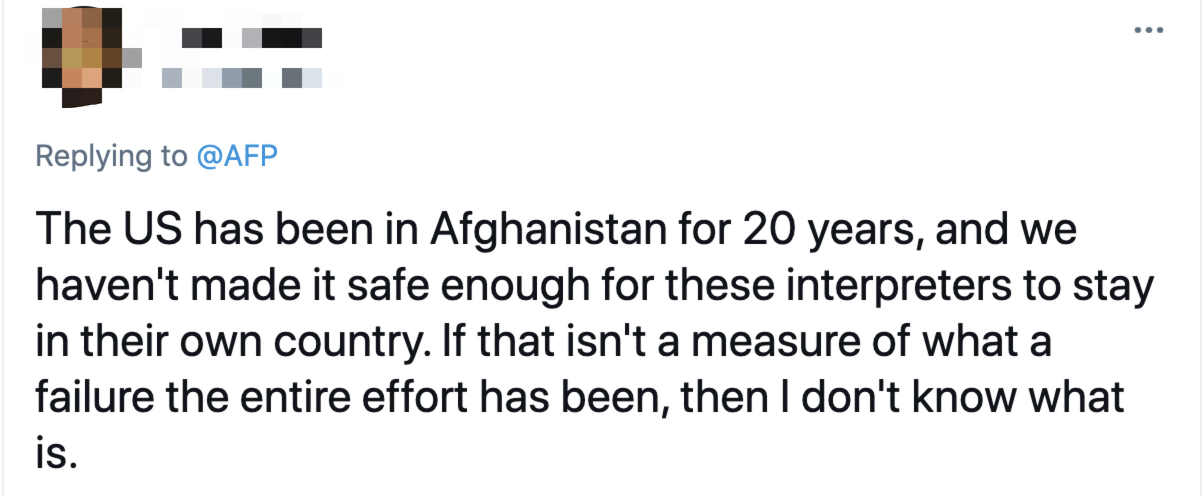 △网民:“美国在阿富汗20年,没有让这些(民众)觉得留在自己的国家足够安全。如果这还不是衡量整个(“反恐”)努力失败的标准,我不知道什么才是。”