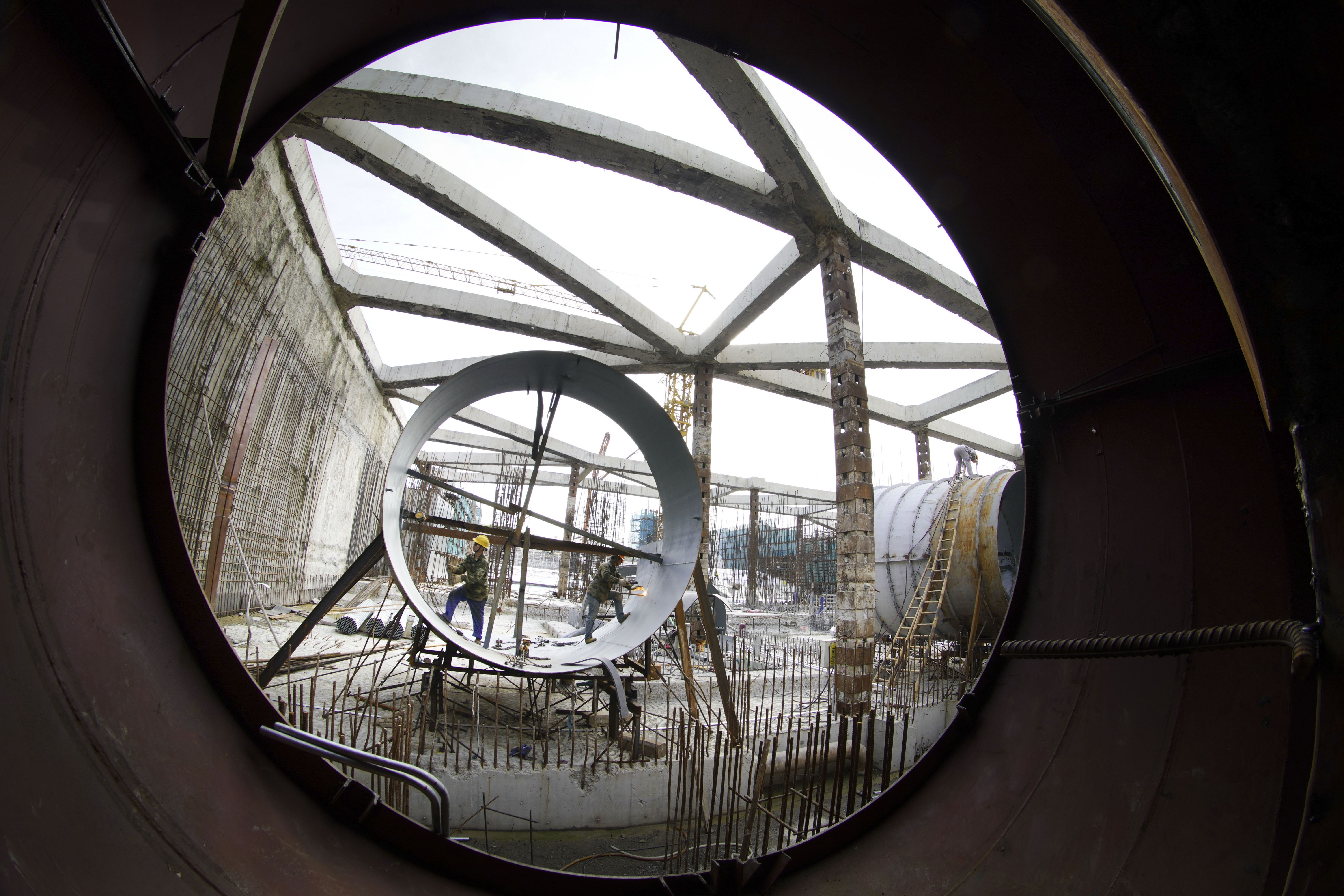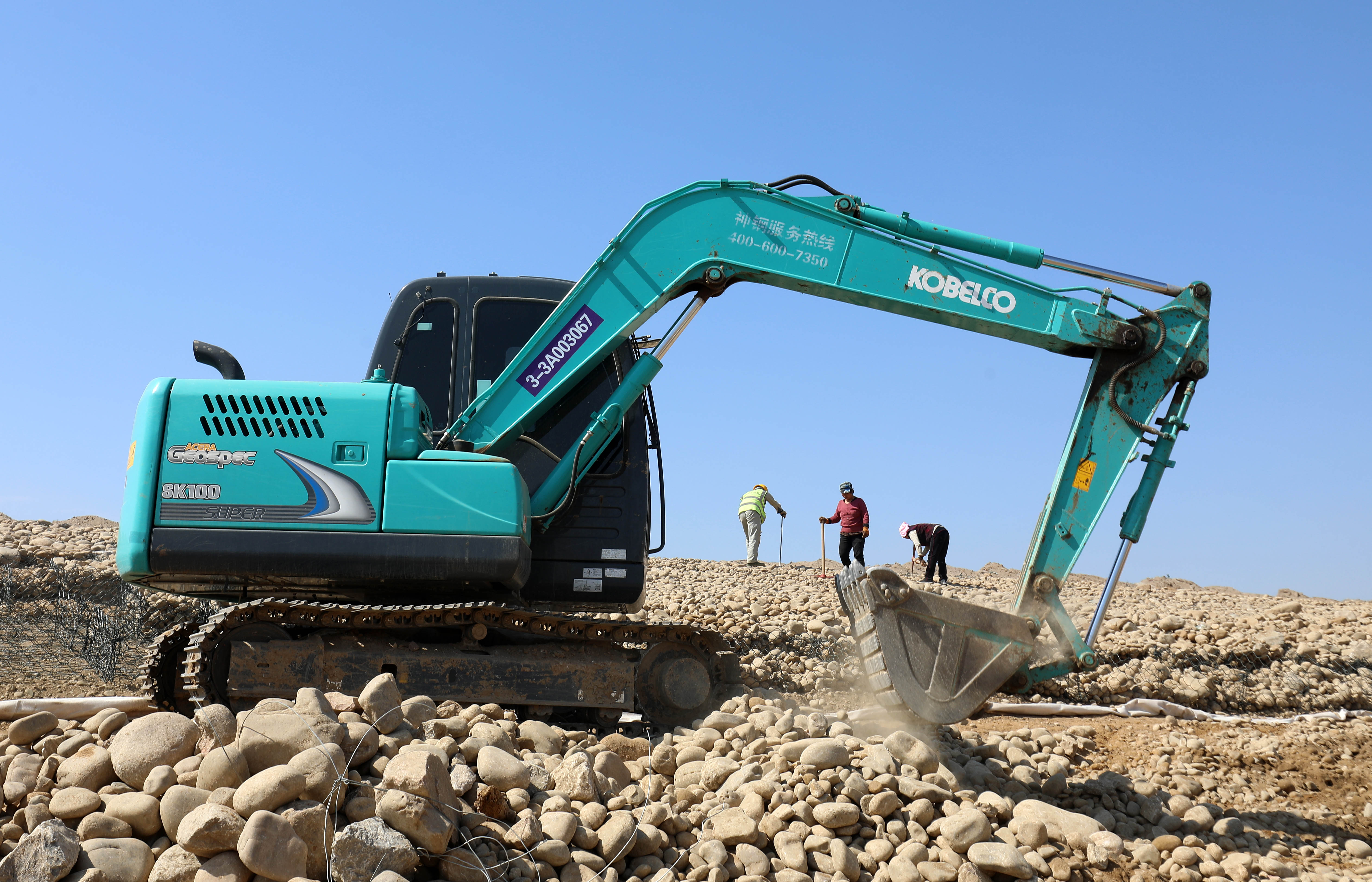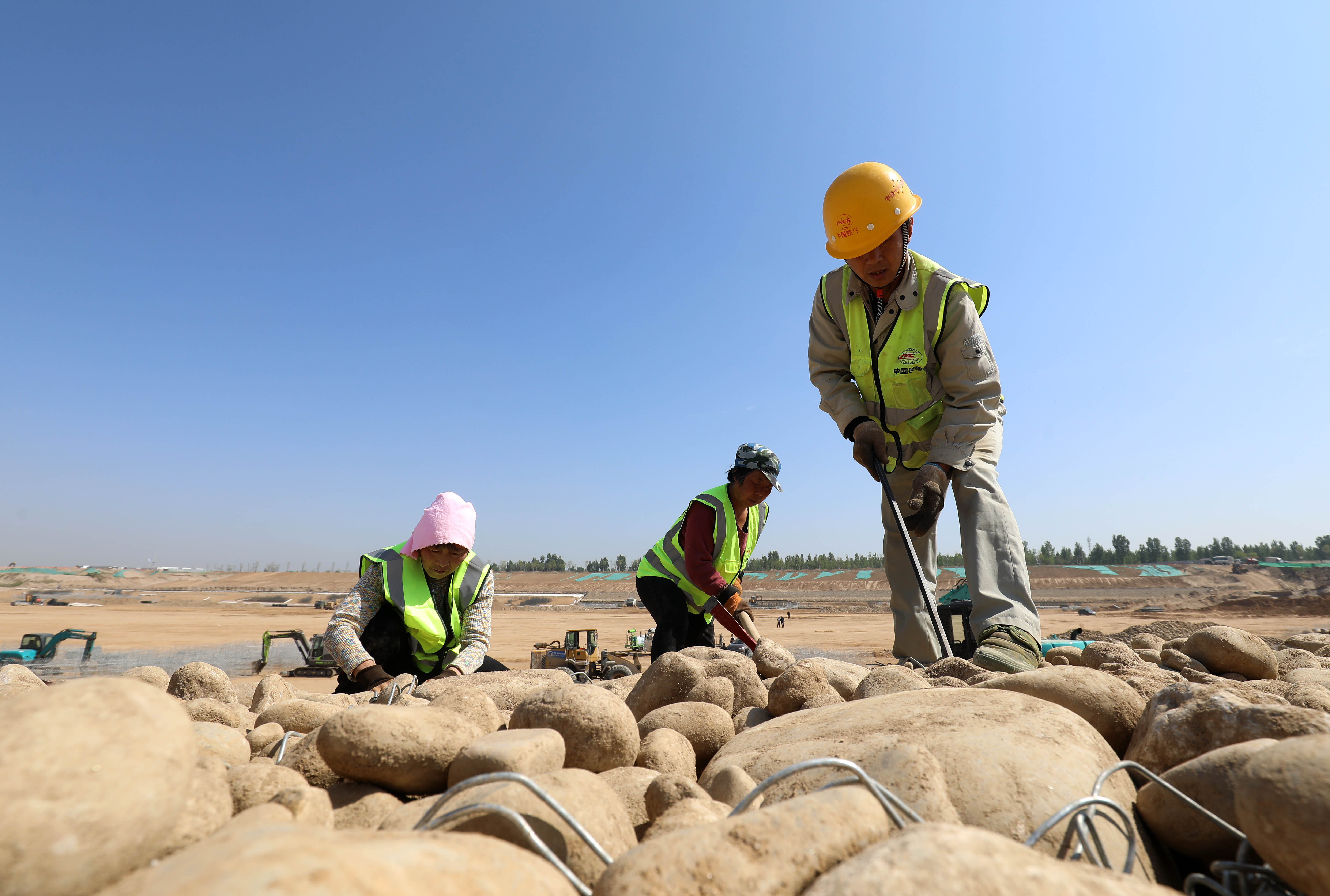 5月1日,中铁十四局集团的工人在石家庄滹沱河生态修复三期工程工地施工。新华社发(梁子栋 摄)