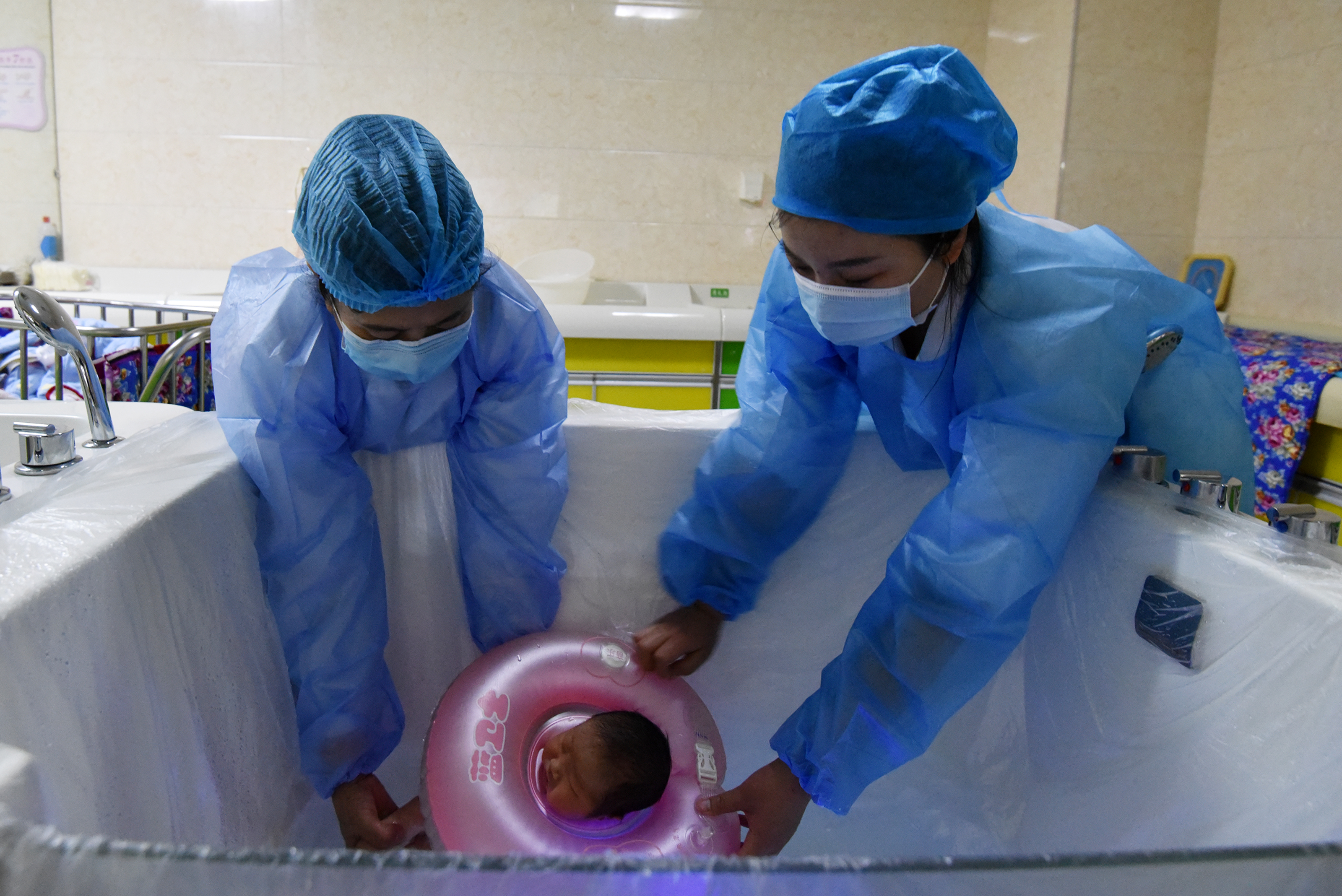 5月1日,河北省张家口市宣化区现代妇产医院的护士在护理新生儿游泳。新华社发(陈晓东 摄)