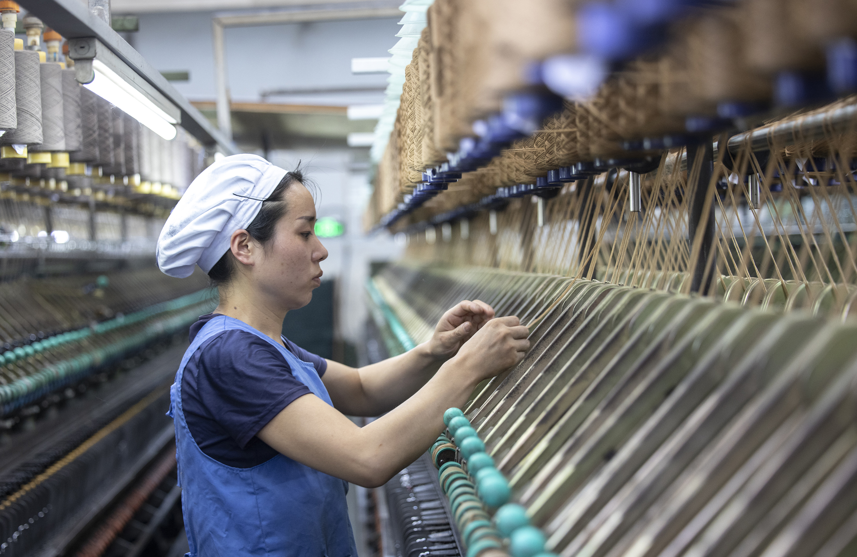 5月1日,在位于浙江省诸暨市的浙江富润纺织有限公司,纺织工人在纺纱车间工作。新华社发(郭斌 摄)