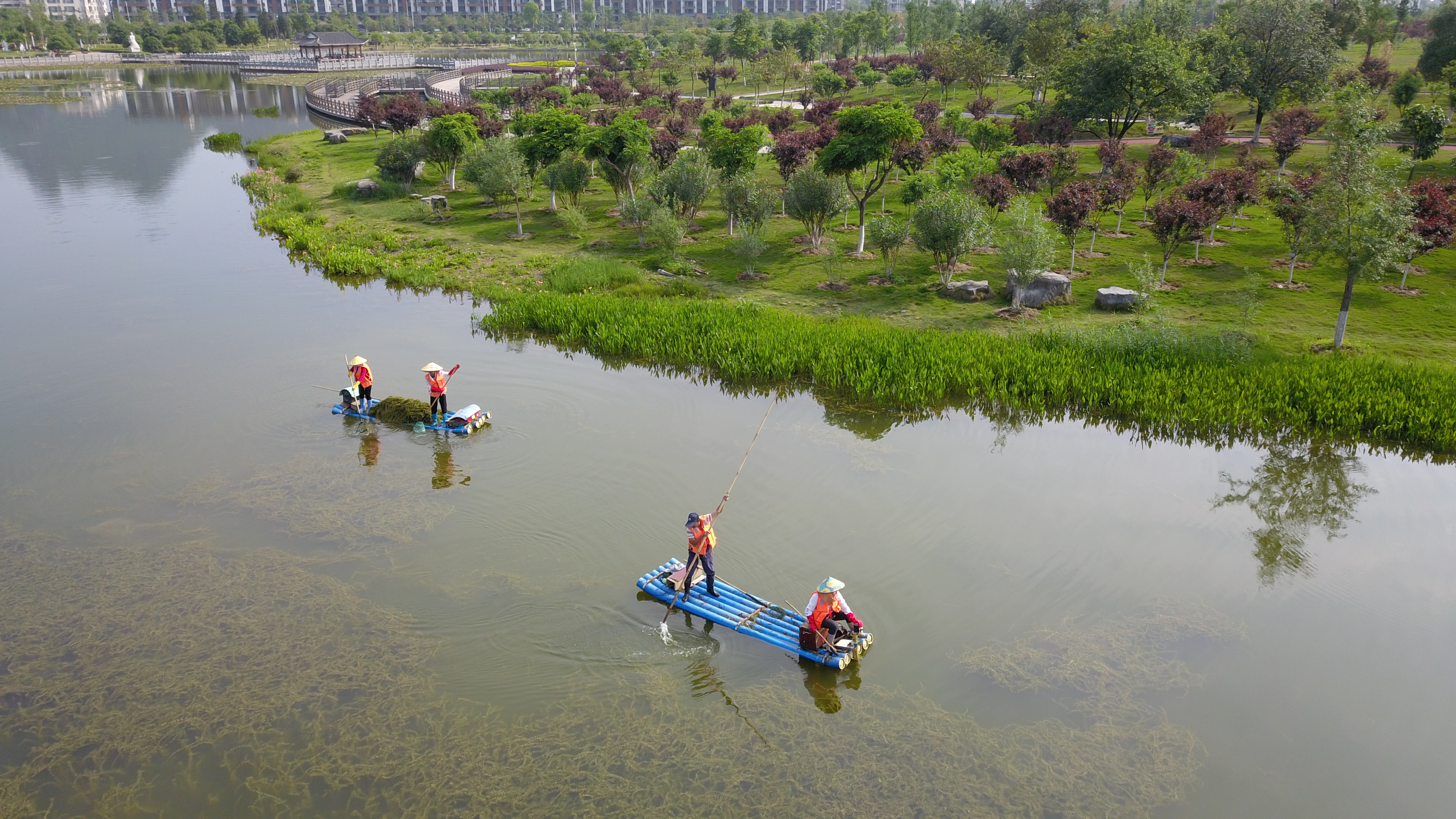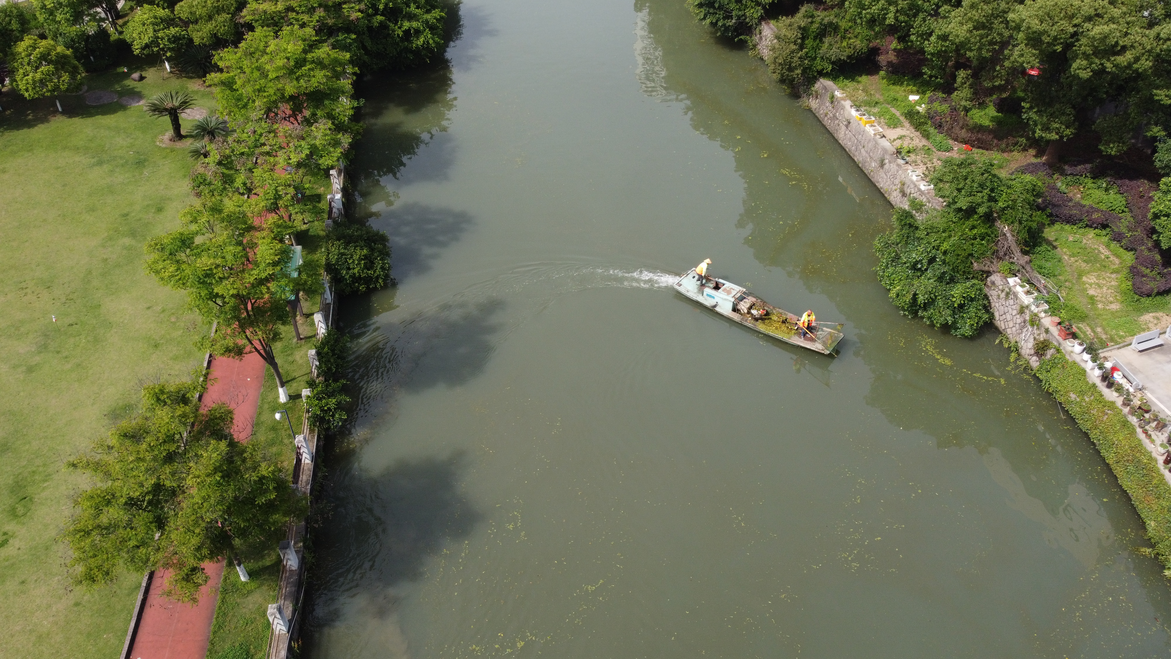 5月1日,环卫工人在浙江省温州市龙湾区汤家桥河河道上打捞浮萍(无人机照片)。新华社发(周汉祥 摄)