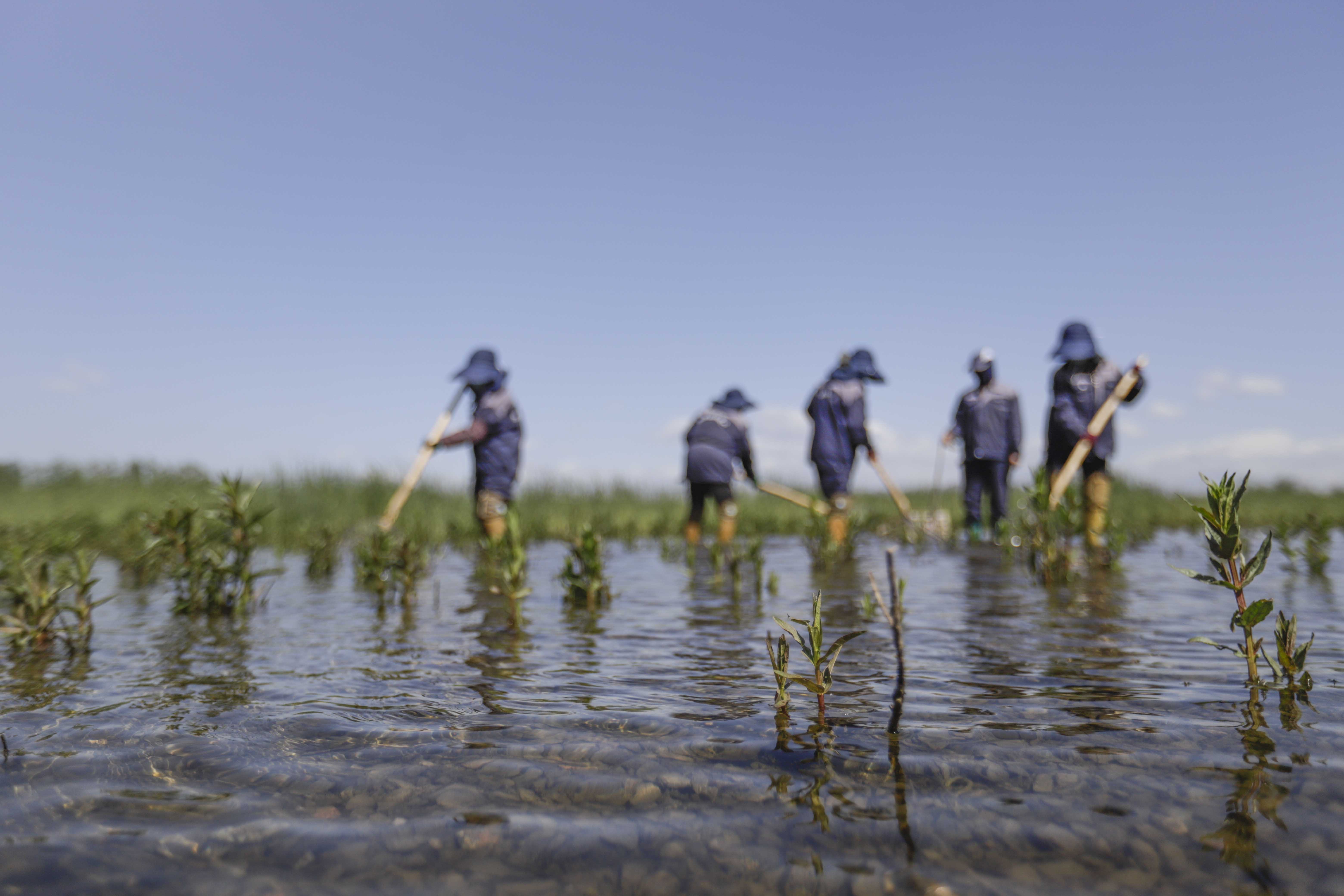 5月1日,工人在河北唐山遵化市水平口湿地公园进行打捞作业。新华社发(刘满仓 摄)