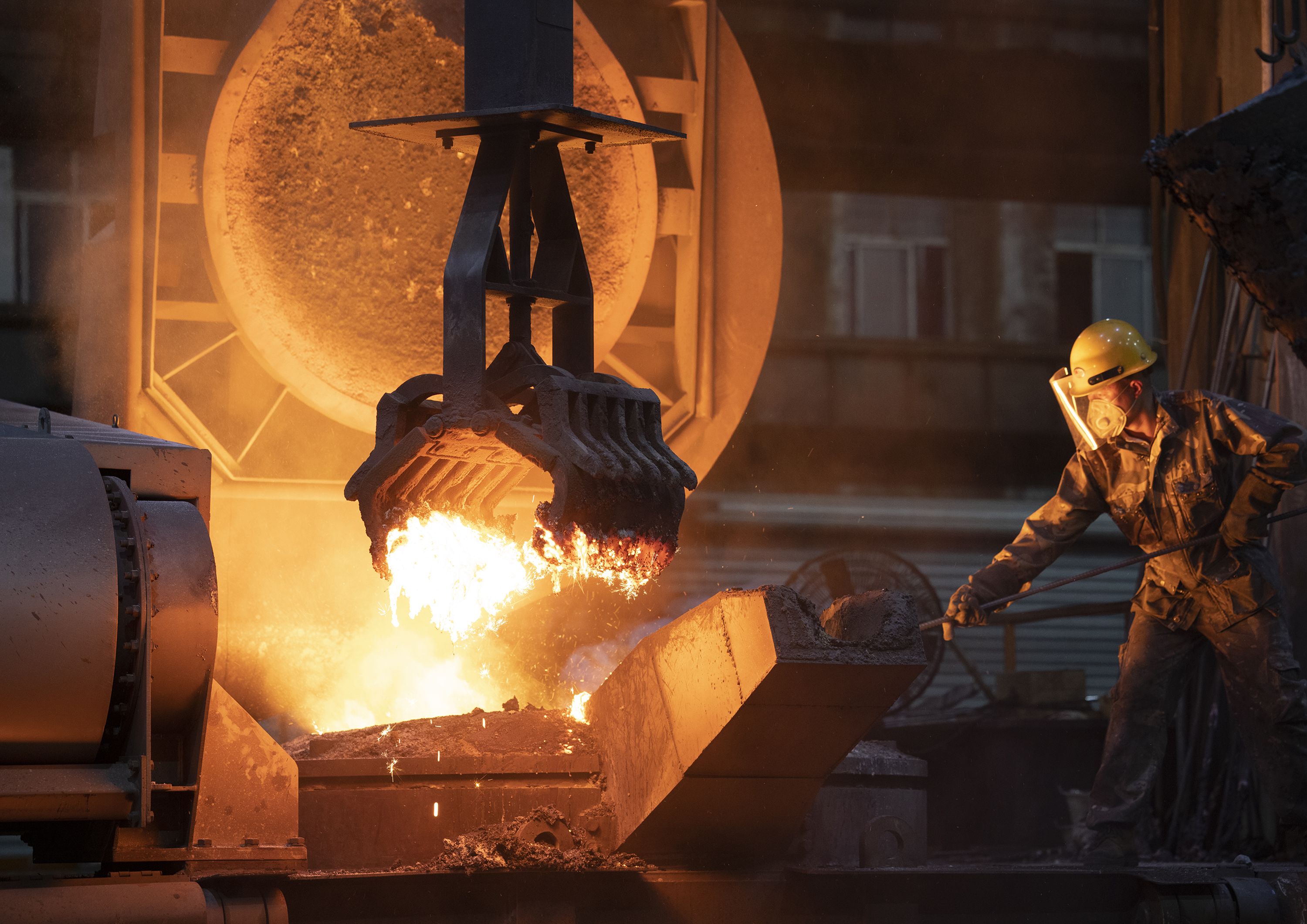 5月1日,在位于浙江省诸暨市姚江镇的浙江杭机铸造有限公司,工人对熔炉内的铁水进行测温和清杂工作。新华社发(郭斌 摄)
