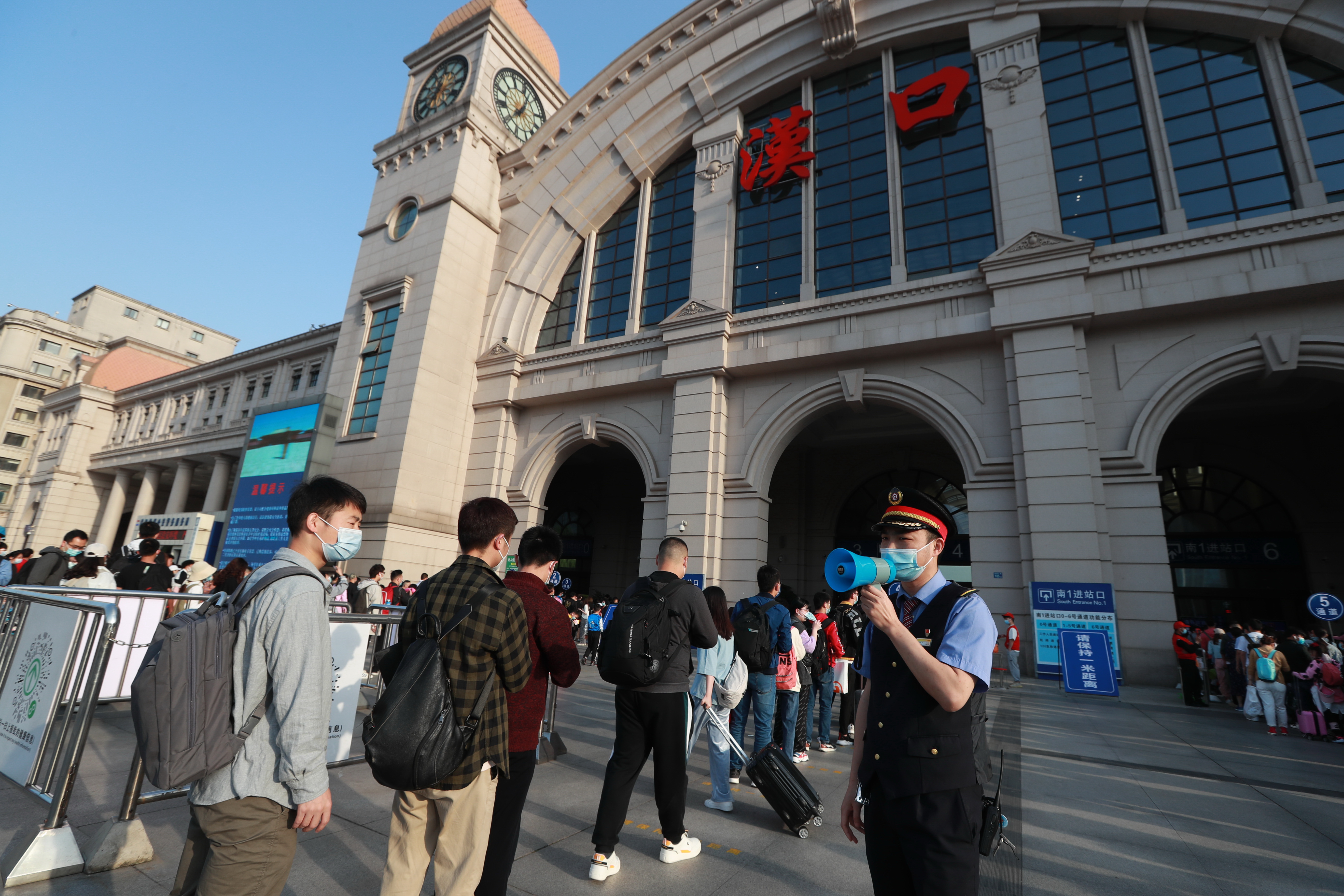 5月1日,工作人员在汉口火车站广场维持旅客进站乘车秩序。新华社发(赵军 摄)