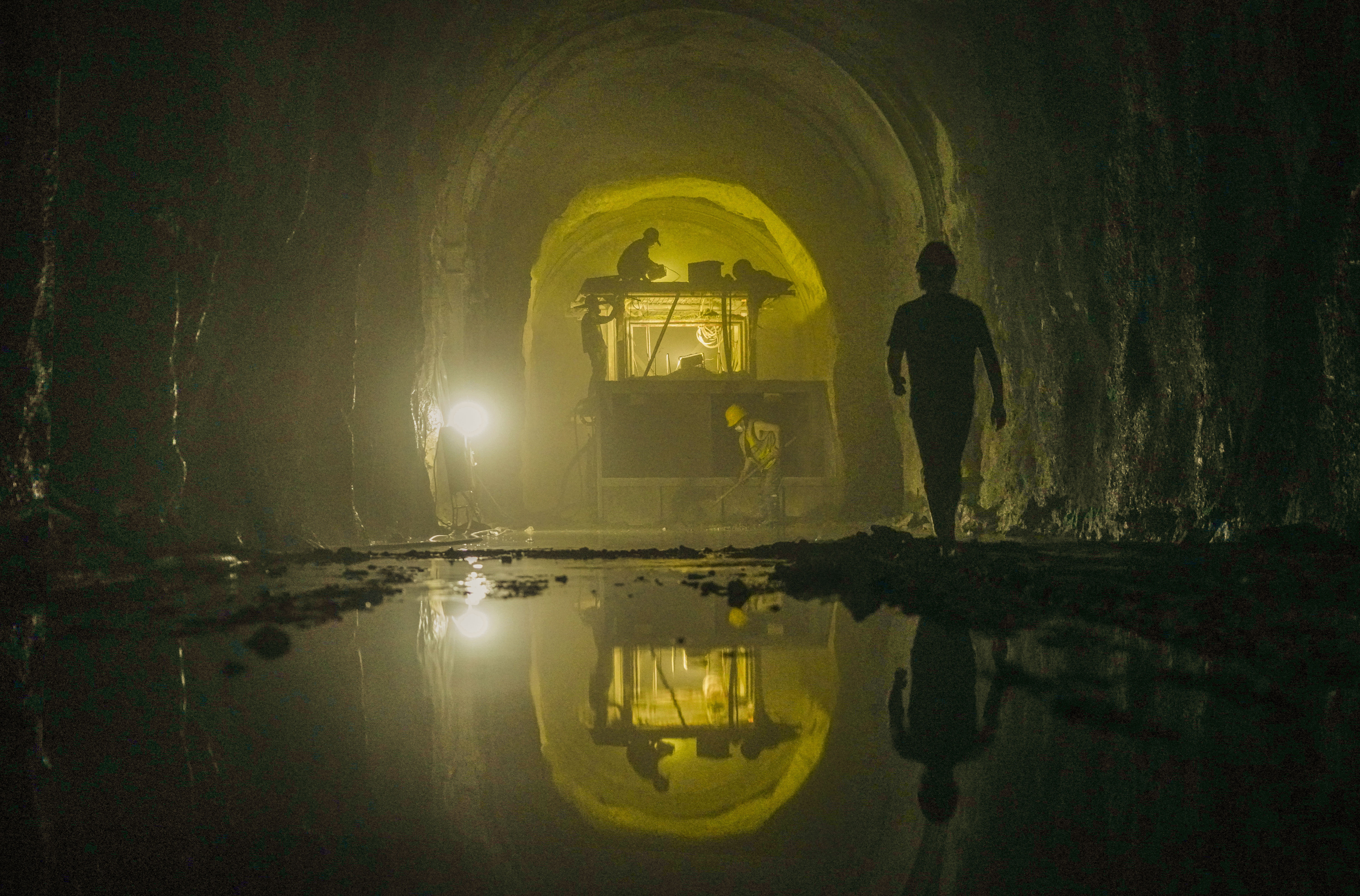 5月1日,在浙江省温州市瓯江引水工程处,工人在引水隧洞内进行喷浆作业。新华社发(苏巧将 摄)