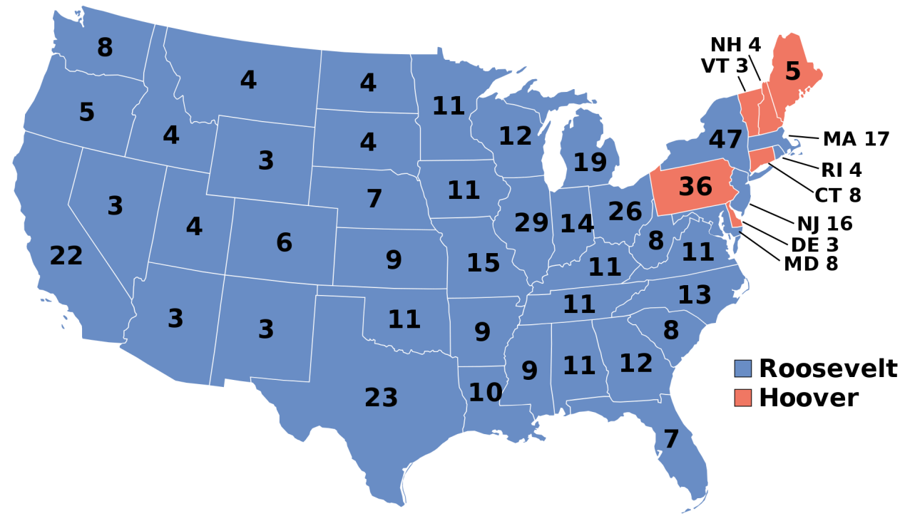 △1932年的美国总统大选,罗斯福(蓝)以压倒性的优势击败胡佛(红)(图片来源:网络)