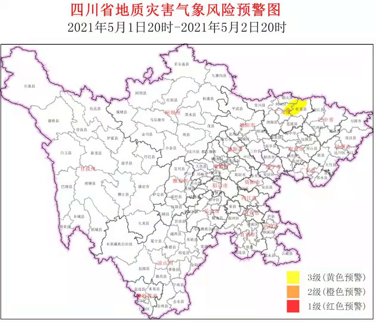 5月1日,四川省地质灾害指挥部办公室发布全省地质灾害气象风险黄色预警。结合四川省气象台天气预报情况, 5月1日20时~5月2日20时,广元利州区、朝天区、旺苍县、昭化区发生突发性地质灾害风险较大(黄色预警)。